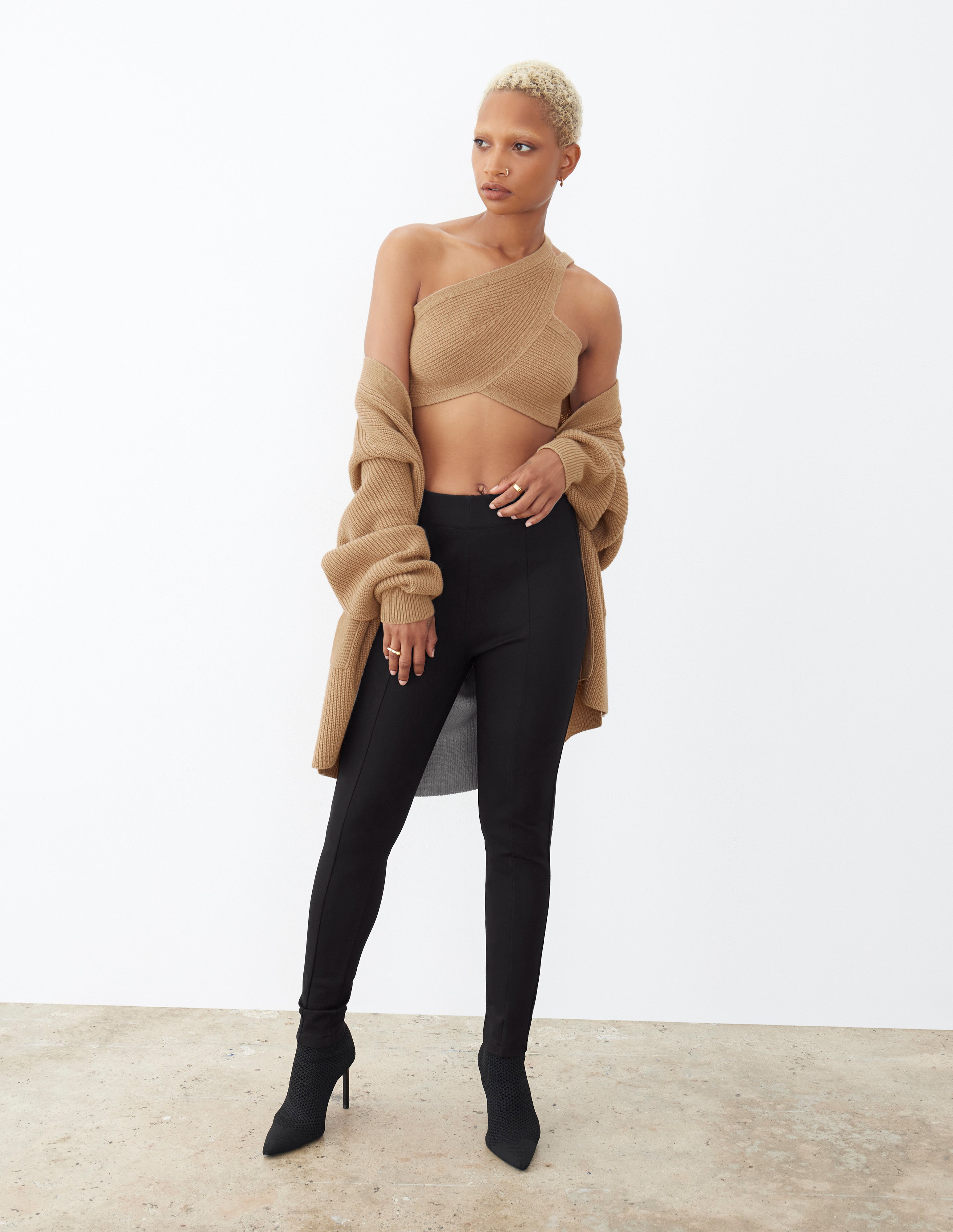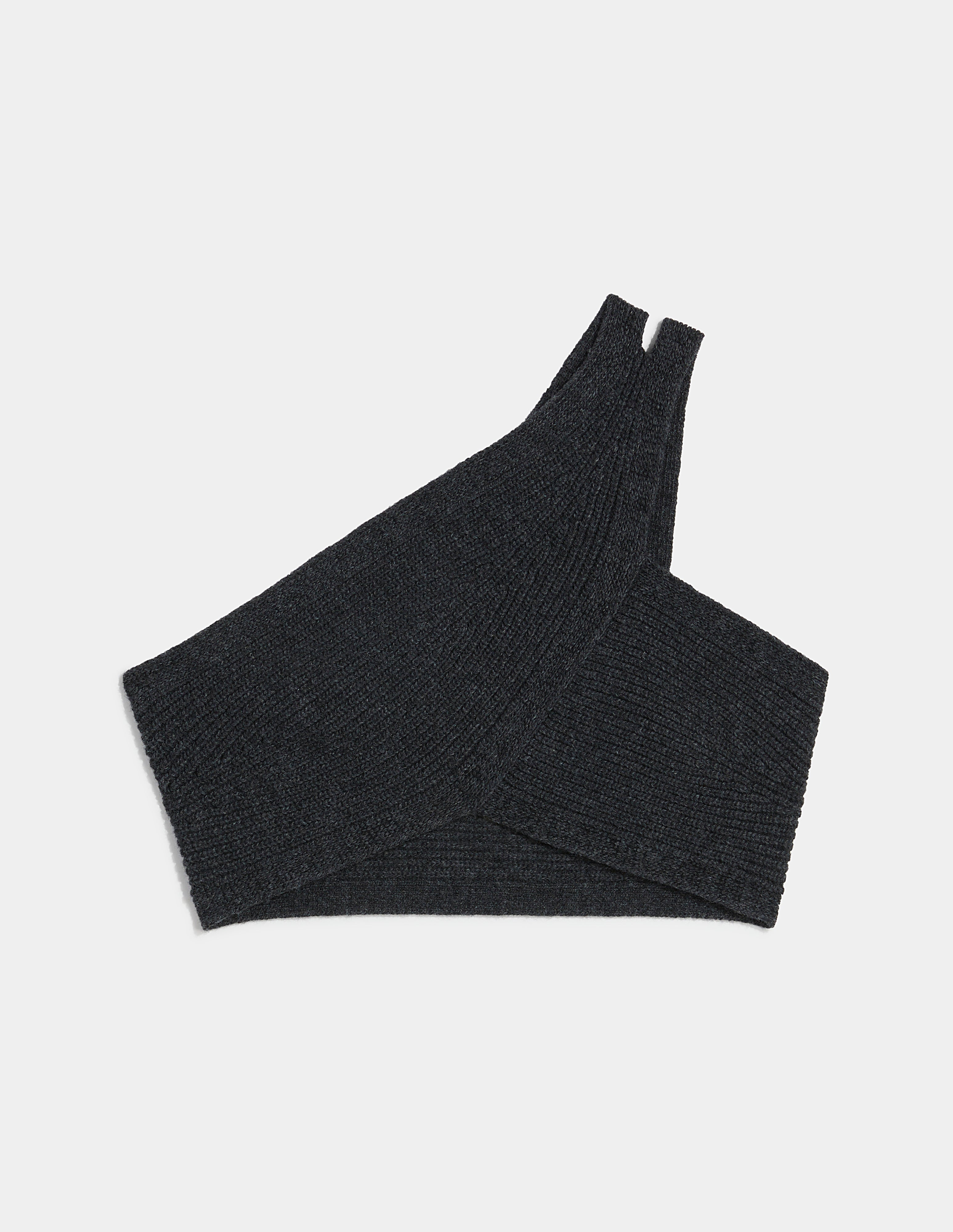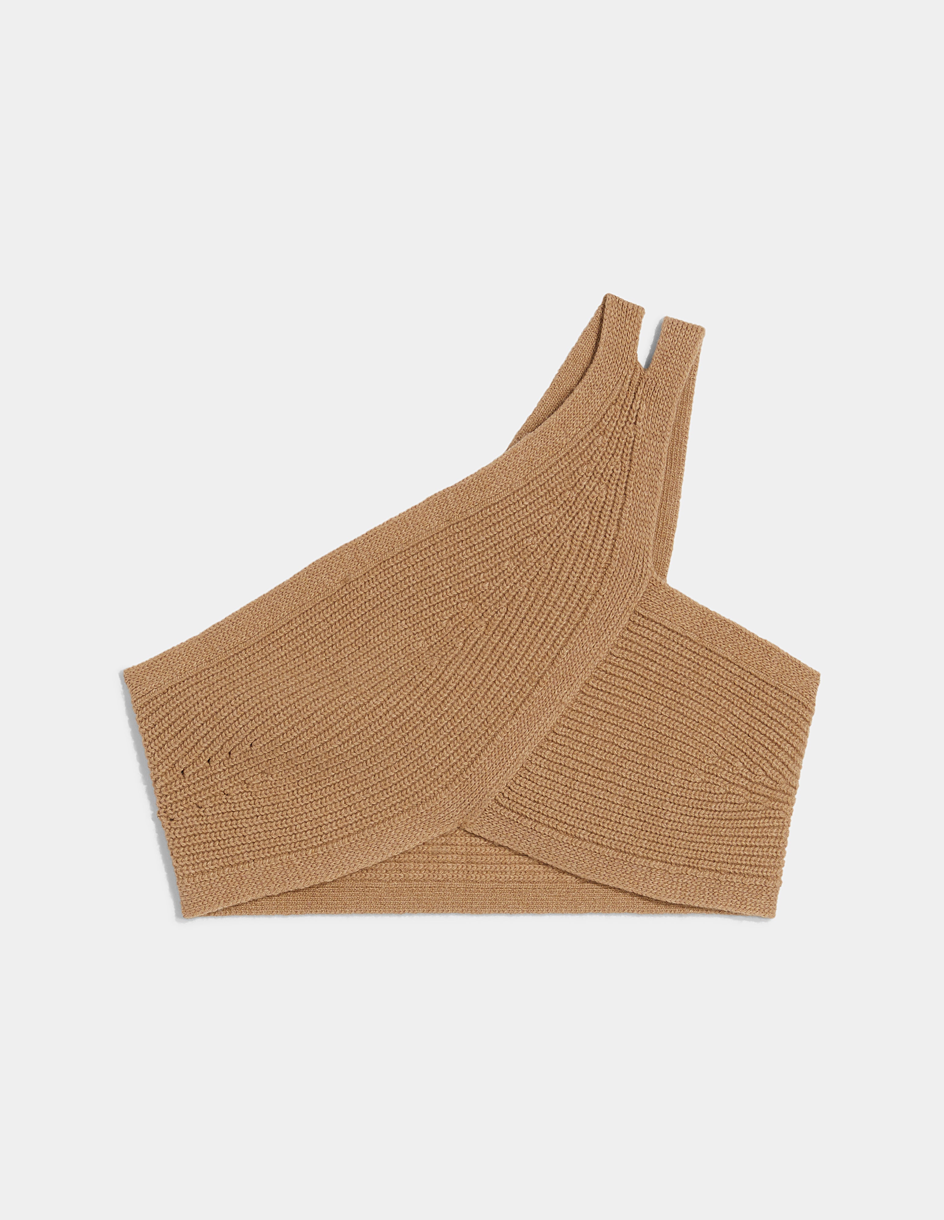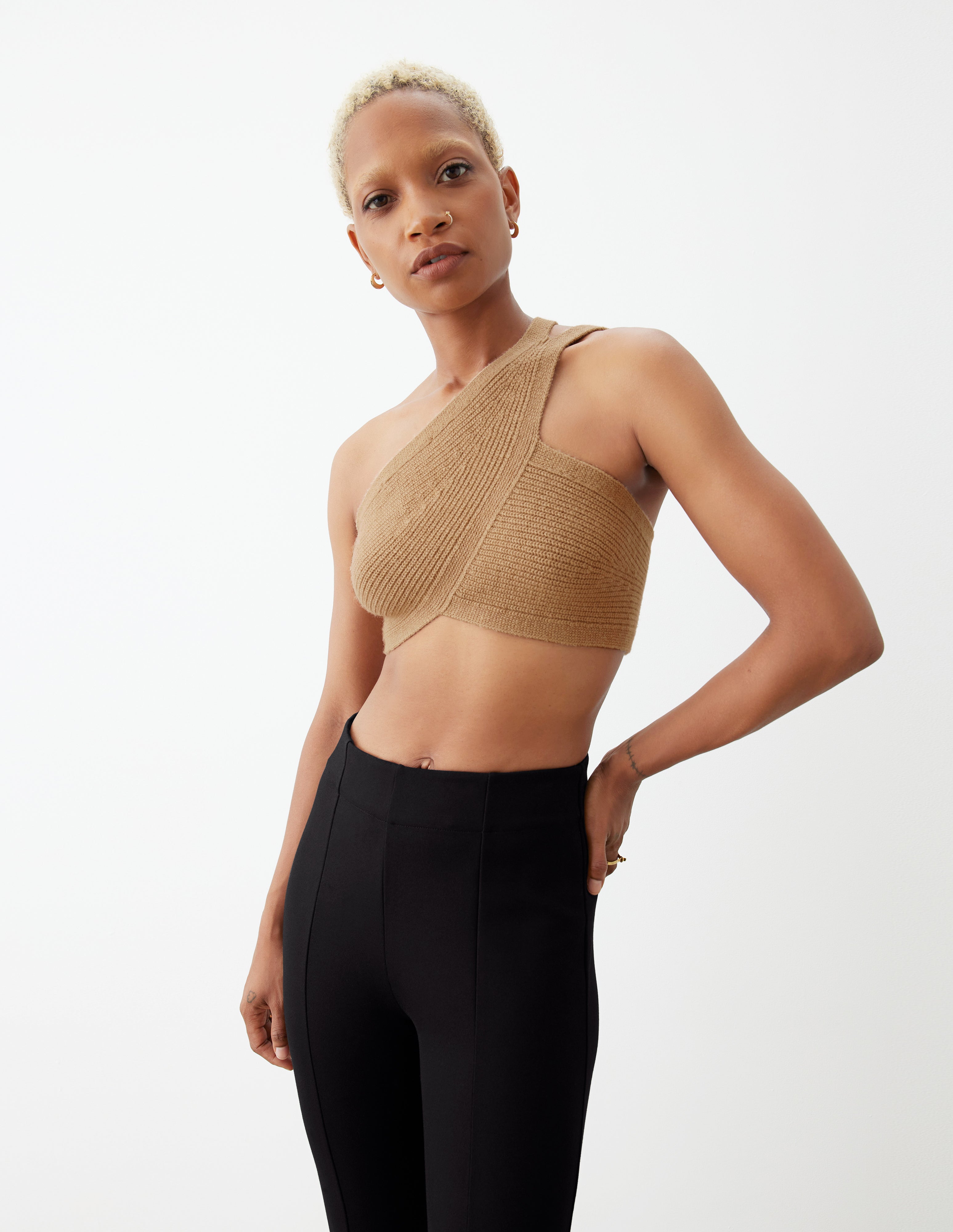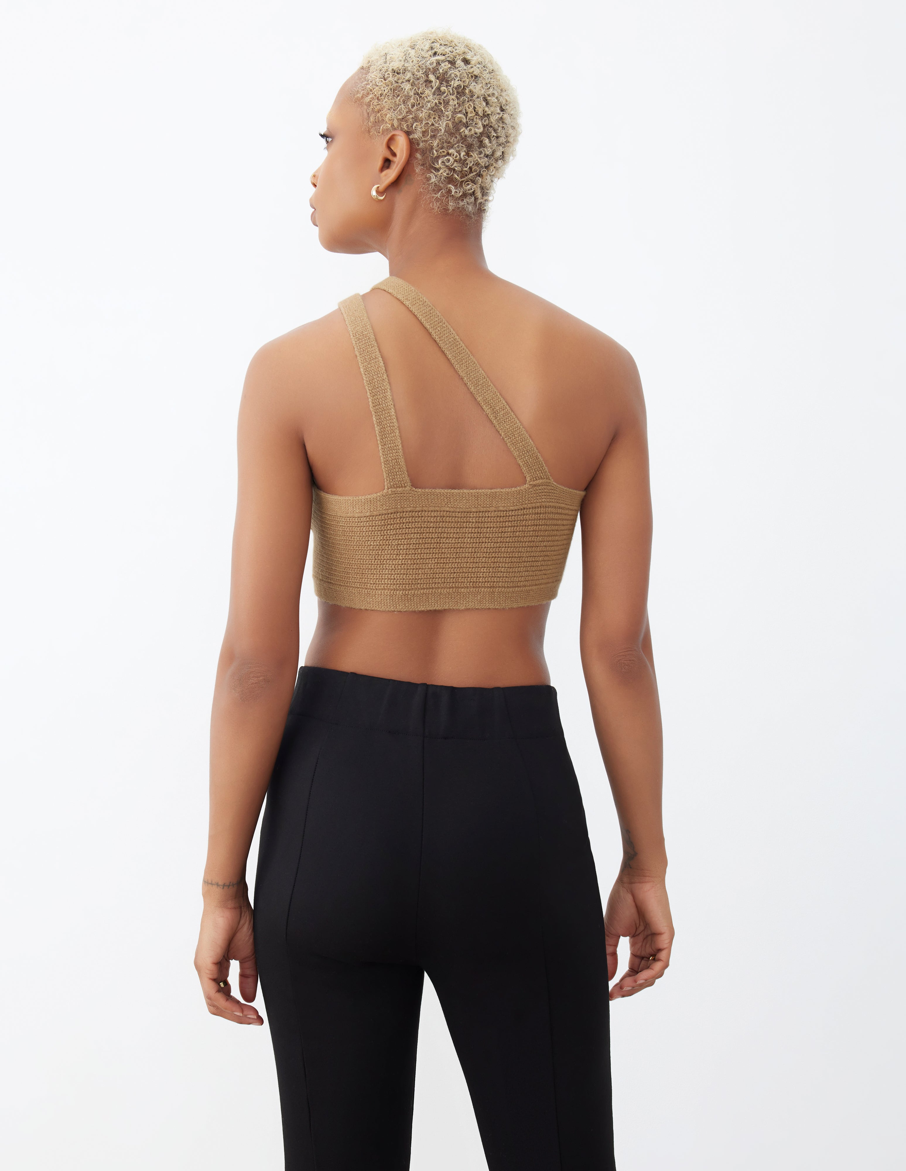 Bandeau coverage with an asymmetric strap make this rib knit bralette sweater a stylish layer or solo piece.