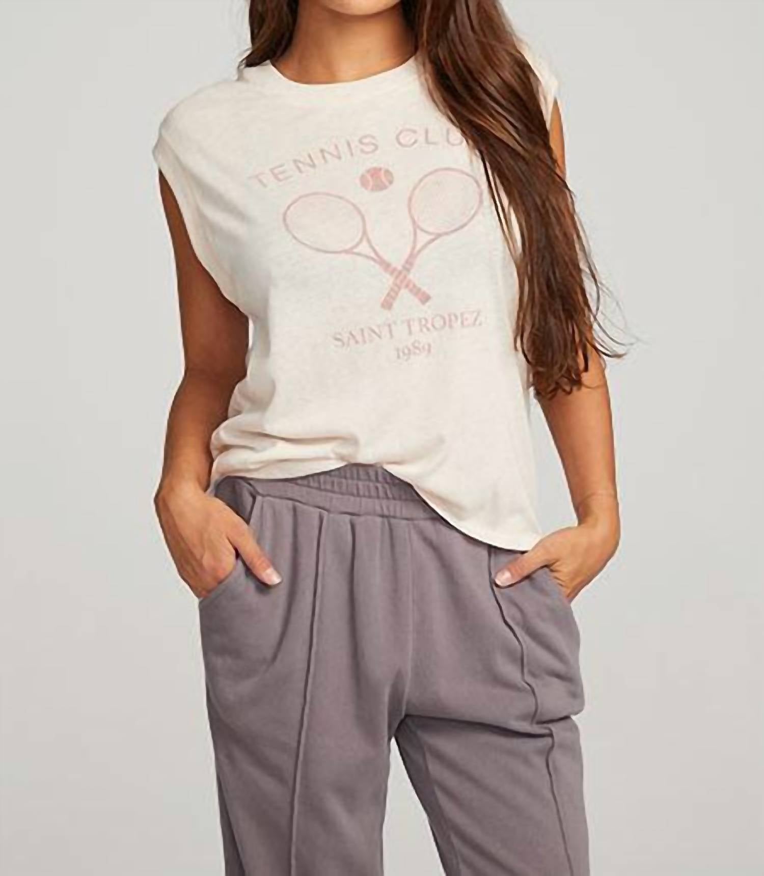 Tennis graphic tee. Crew neck. Sleeveless. True to size. Comfortable and relaxed fit.