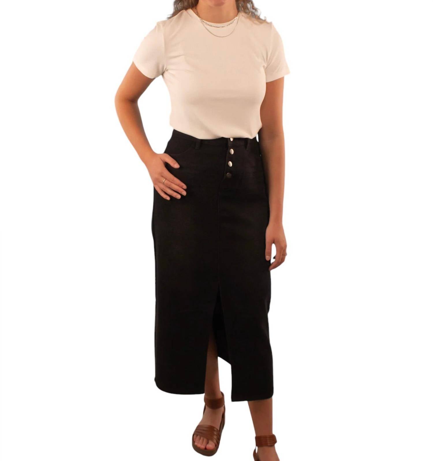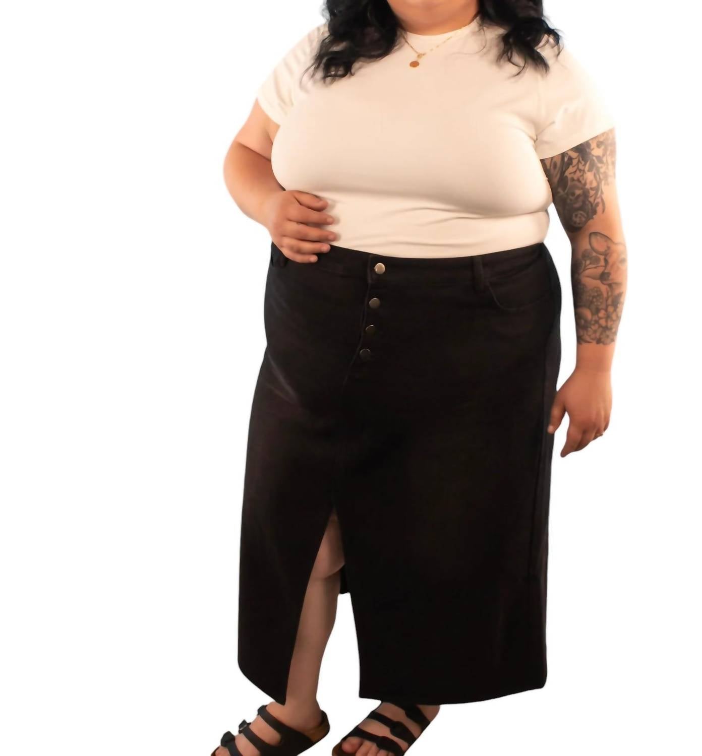 Show off just the right amount of skin in this beautifuly designed midi length skirt. This Maxi Denim Skirt features a 4-button fly, functional jean pockets, and a chic slit at the knees. Made from a soft 89% Cotton, 6% Polyester, 5% RC blend, it offers style and comfort, perfect for casual or dressed-up looks.
