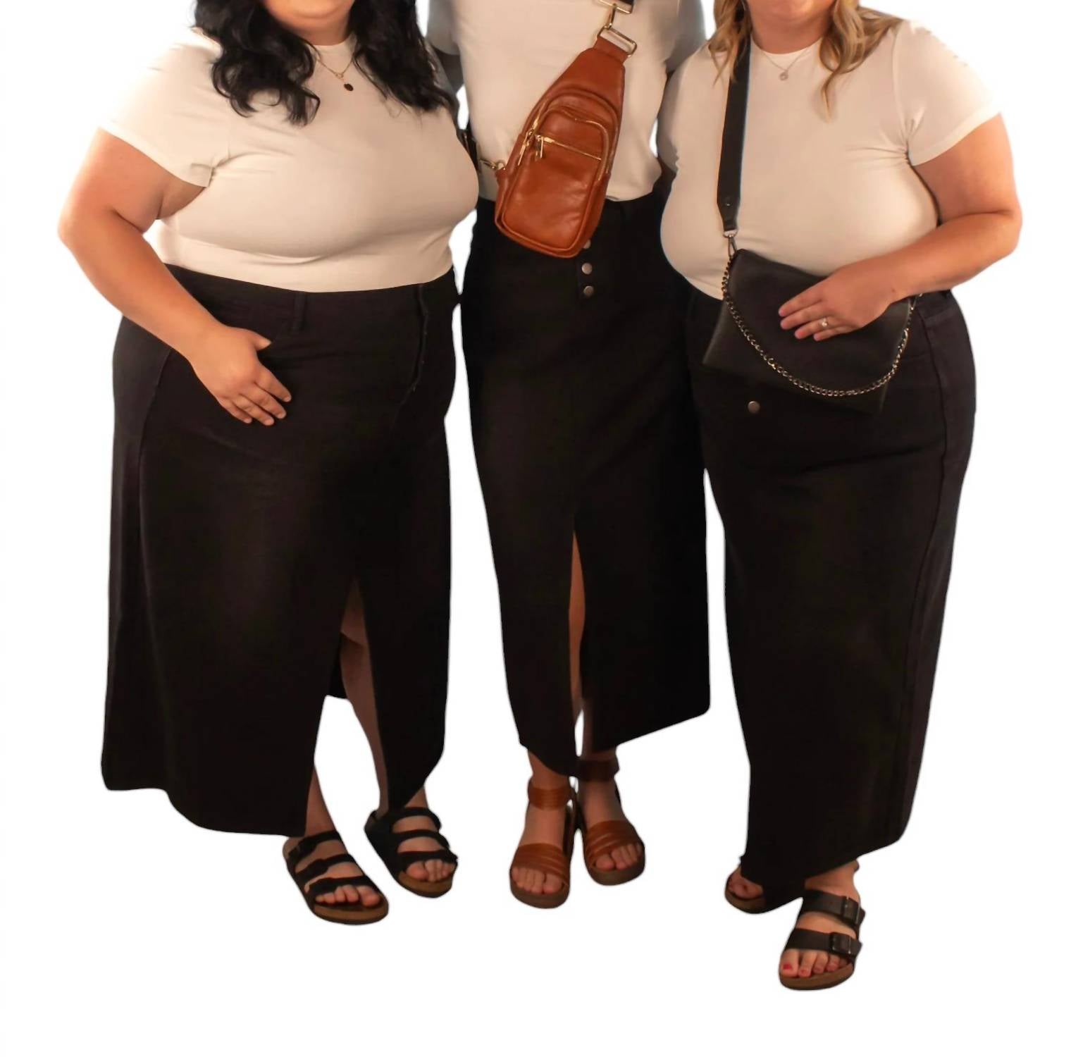 This Maxi Denim Skirt features a 4-button fly, functional jean pockets, and a chic slit at the knees. Made from a soft 89% Cotton, 6% Polyester, 5% RC blend, it offers style and comfort, perfect for casual or dressed-up looks.