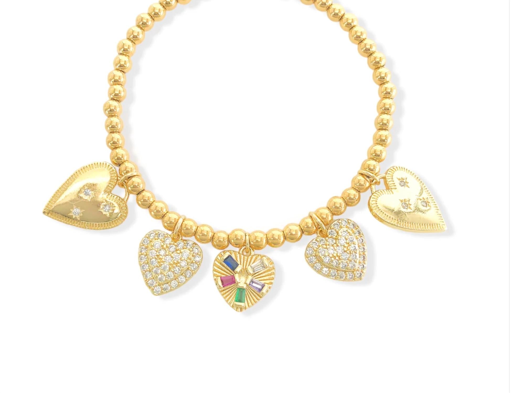 This stand-out bracelet is good enough to wear on its own, or stacked with your favorites. Enhance your ensemble with the Women's Heart Stretch Bracelet by OMG BLINGS, showcasing a charming array of five dangling hearts. Crafted with 14k gold-plated cubic zirconia charms and 3mm stainless steel beads, this piece offers a delightful blend of elegance and whimsy. Ideal for stacking, this bracelet brings a playful sophistication to any occasion. Embrace your romantic side with this versatile accessory in classic gold.