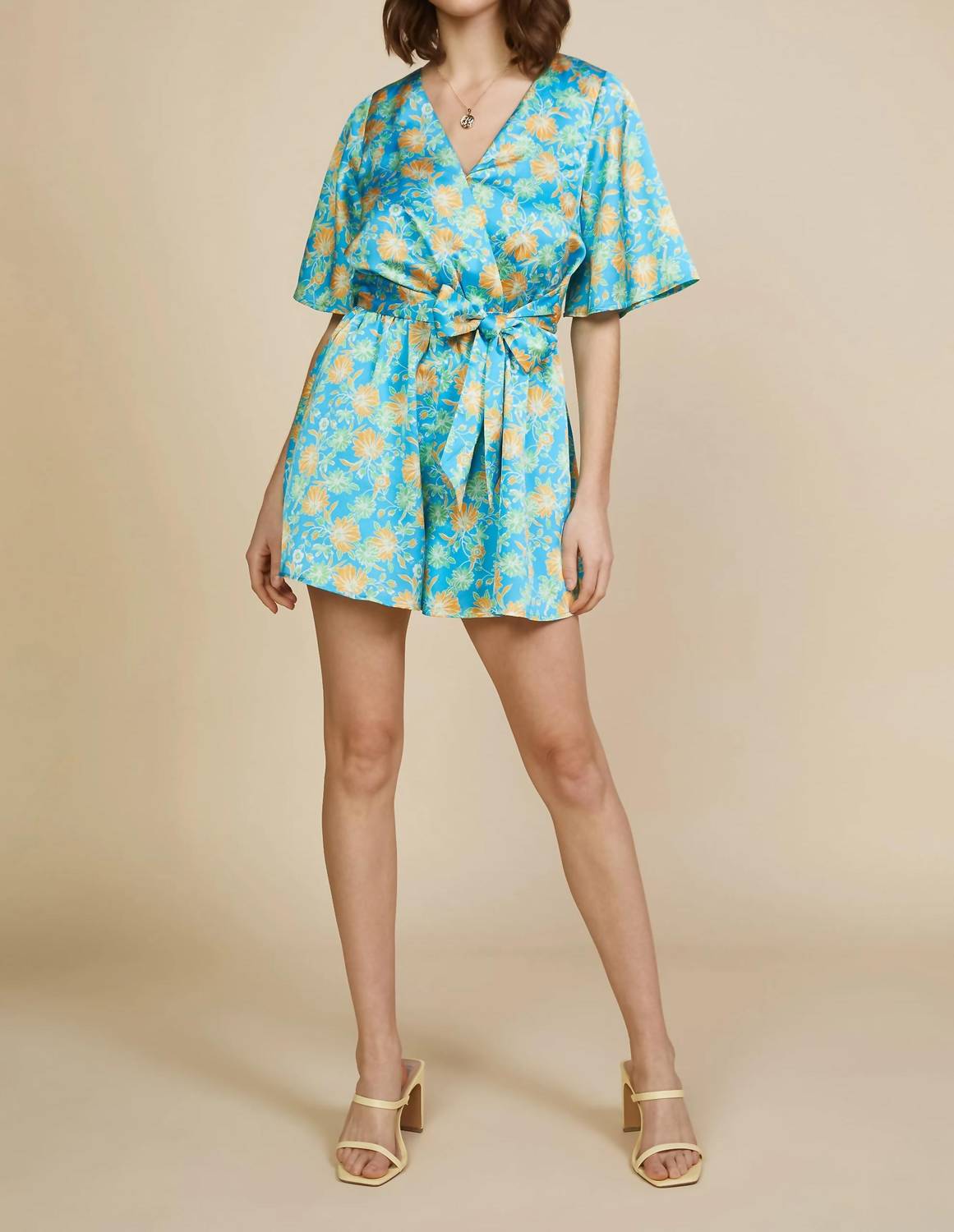 Whimsical floral-print romper features a surplice-style bodice with flouncy half sleeves, a cinched waist, and an integrated self-tie belt. Model is 5'8" Bust: 32B Waist: 25" Hip: 34" wearing size Small. 100% Polyester.