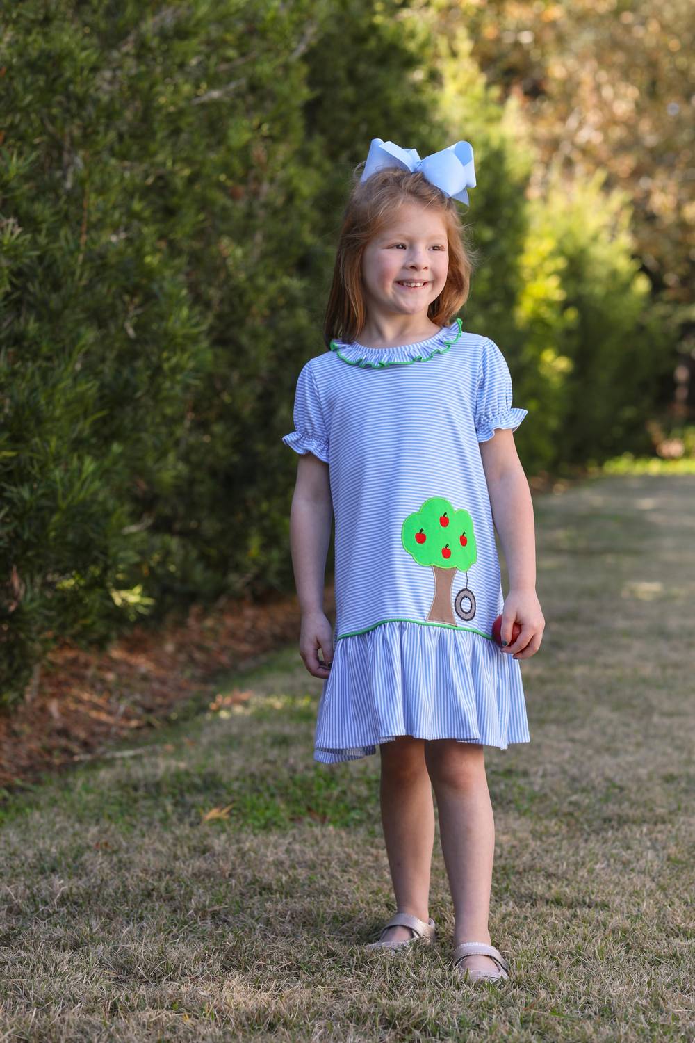 The Trotter Street Kids Girl's Apple Tree and Tire Swing Dress effortlessly combines charm with preppy style, making it an ideal choice for Spring. This casual dress features a delightful stripe pattern in blue and green, perfect for holiday parties like the 4th of July. Crafted with sweet appliques, it captures a playful and seasonal vibe.
