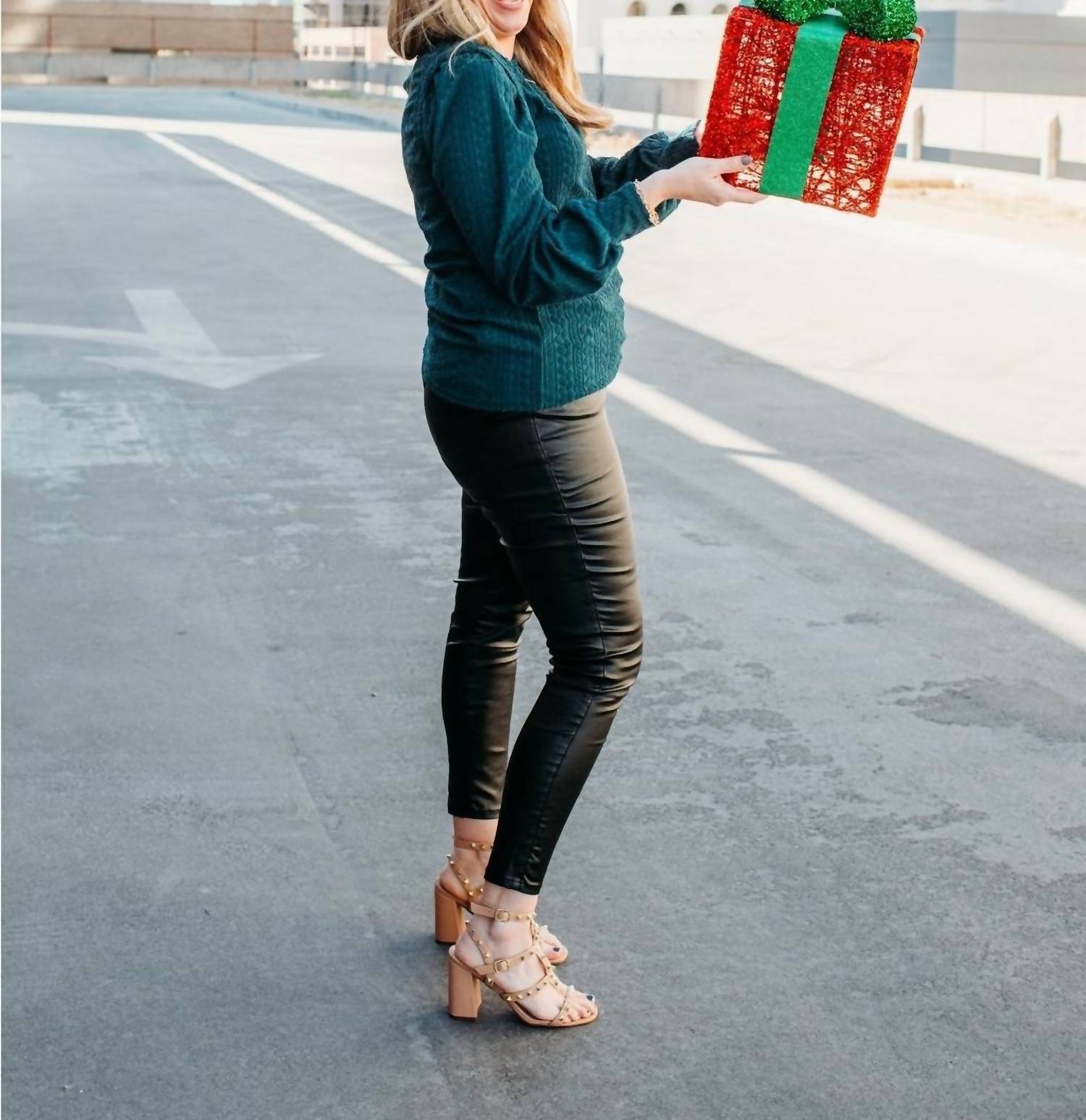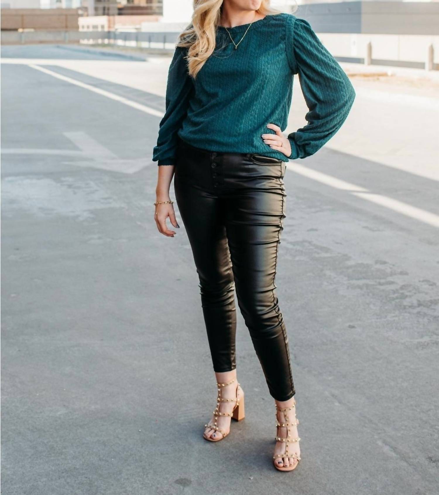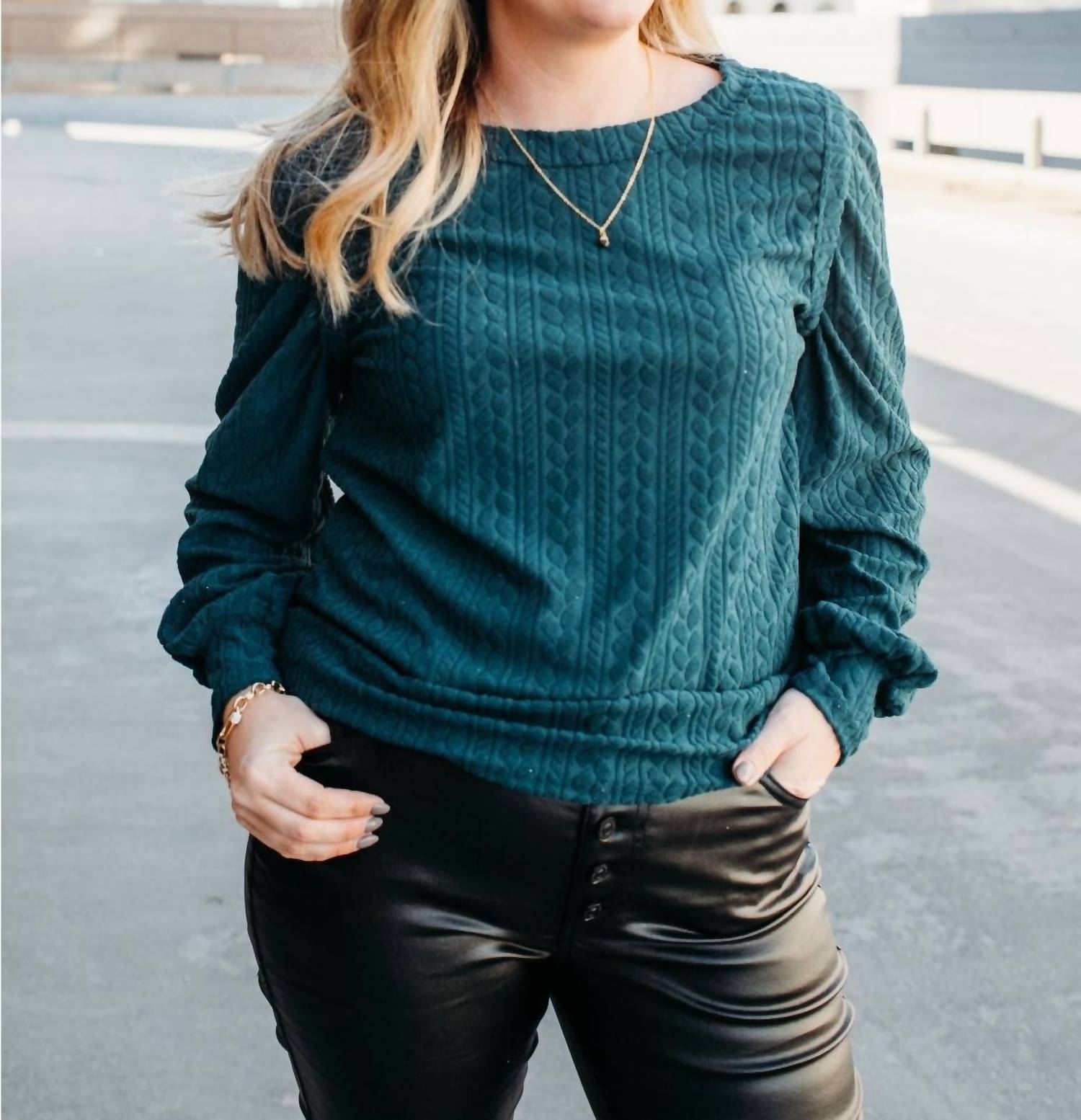 A versatile blouse that works from desk to dinner! Embrace the cooler months with the BiBi Hunter Texture Top, a stunning green blouse designed for versatile wear. Crafted from 100% Polyester, this long-sleeve piece features a rich sweater texture and a flattering boatneck. With a convenient pull-on closure, it's a stylish match for both pants and skirts. The fit is true to size; the model is 5'6", has a 34C bust, and is wearing a size medium.