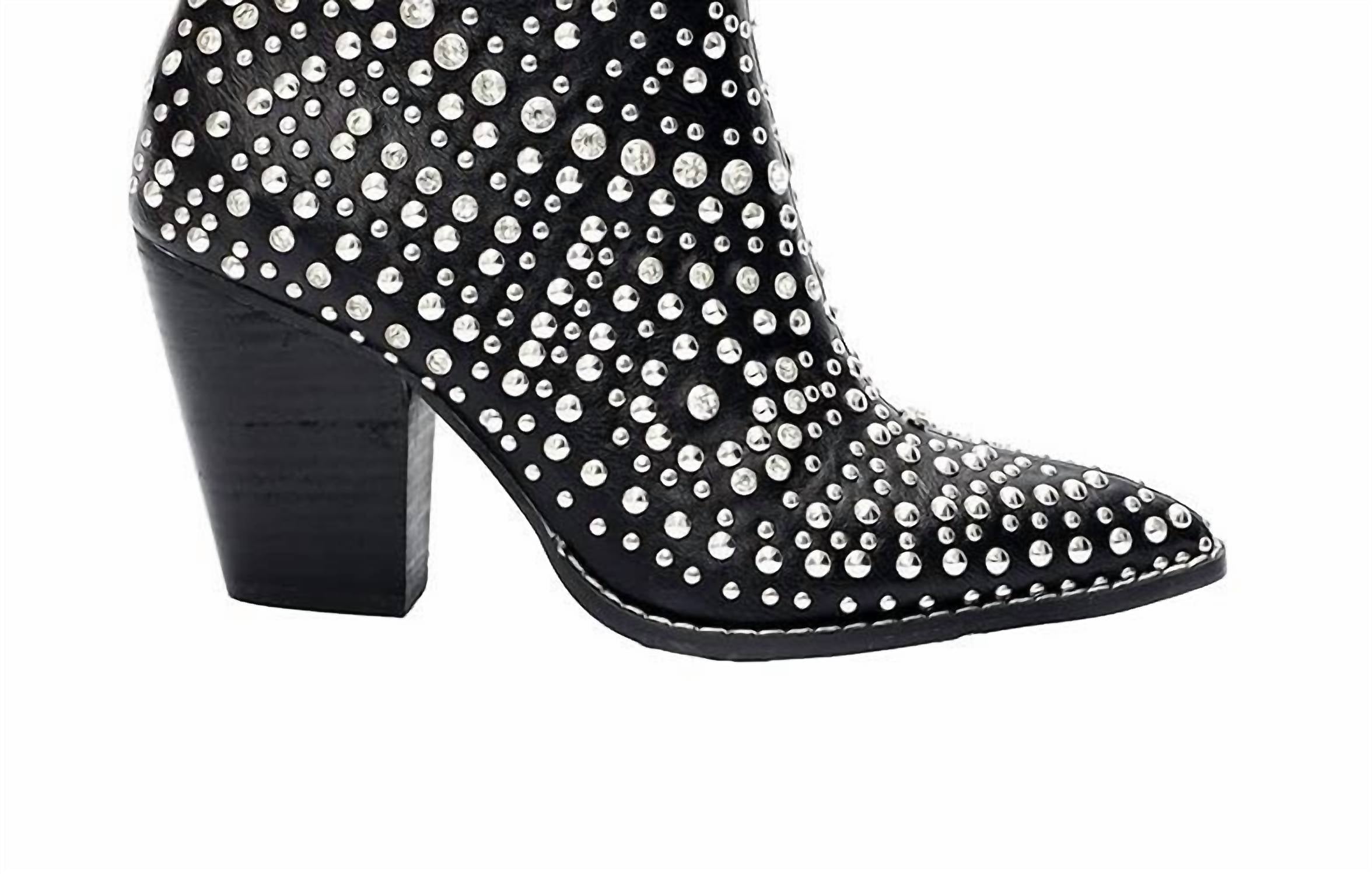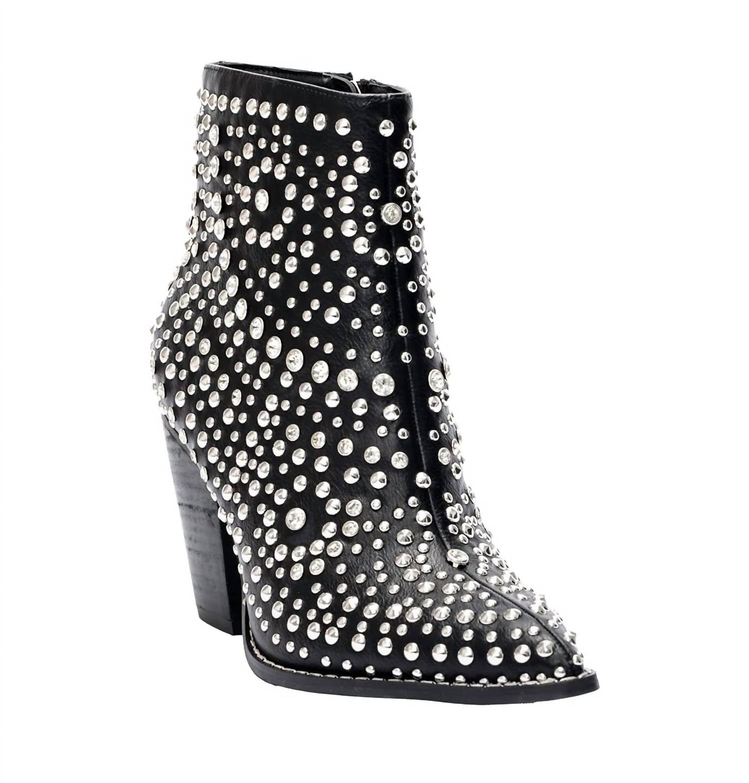 Say hello to the perfect, most versatile boot. The ankle height makes this style easily transition from day to night. Wear them with your favorite skinny jeans and tee for a more laid back look, or pair them with your favorite mini dress and jacket for a night out on the town. Step boldly with the Women's Line Dance Bootie by Corkys Footwear, where style meets functionality. These black ankle booties boast a striking 3-inch block heel, offering a mid heel height that enhances posture and provides a leg-lengthening effect. Complete with stud and crystal embellishments, these boots are not just visually appealing but also feature Corkys cushioned insoles for all-day comfort. An inside zipper ensures easy on and off, while the pointed toe shape adds a touch of sophistication to every step.