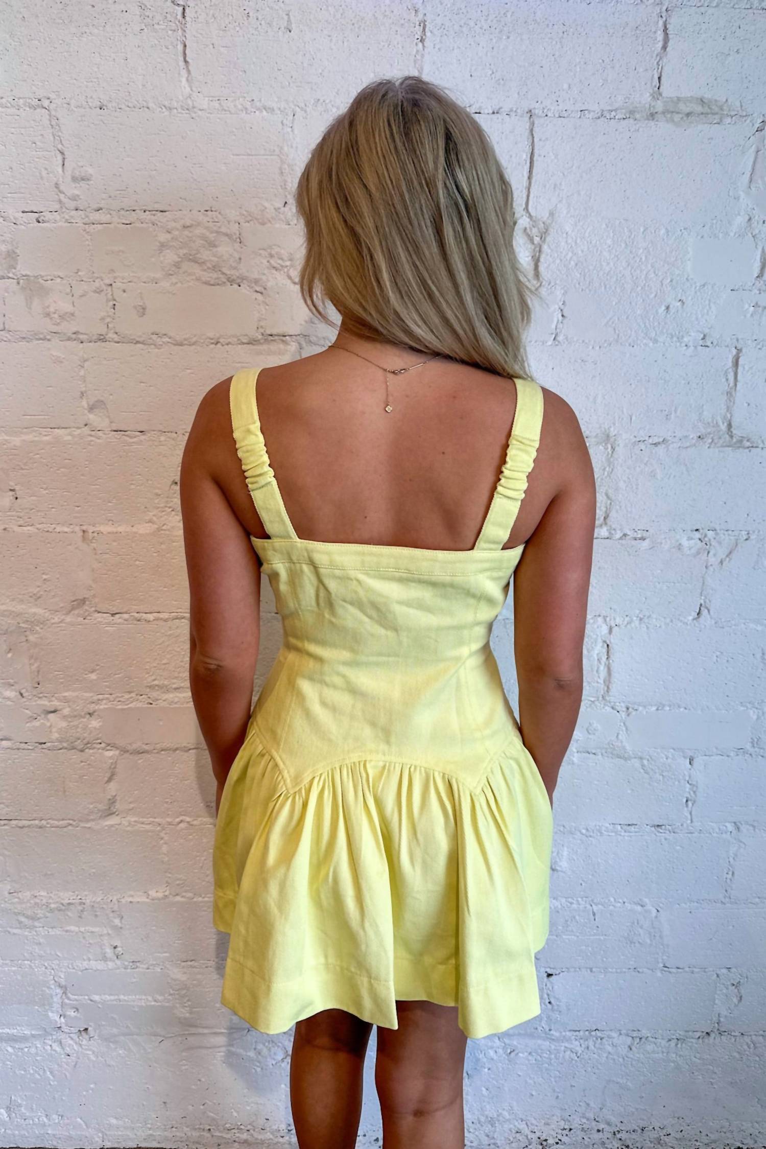 The Sunshine Twist Mini Dress by Day + Moon is a sleeveless delight crafted from 100% breathable cotton, ideal for your summer wardrobe. Embrace its fit and flare silhouette, which hits at a playful mini length, complementing its solid yellow shade. Designed with a chic squareneck and modern twist-front detail, it secures with a zip closure. Made for easy maintenance, simply hand wash cold and hang dry to keep it looking fresh.