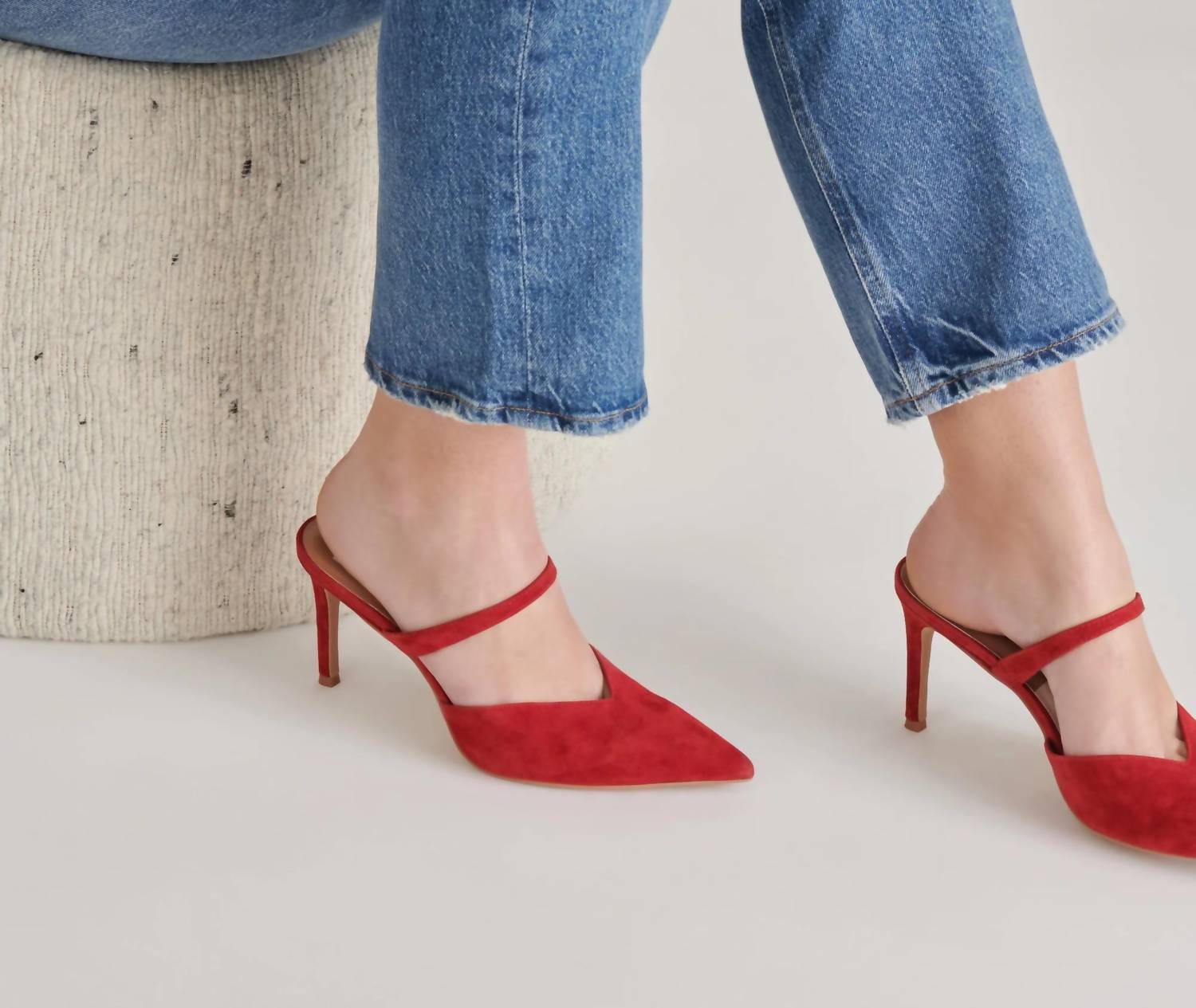 The perfect height for day to night. Introducing the Kanika Heels by Dolce Vita, a dynamic choice in a bold Crimson Suede finish. These women's stiletto heels boast a pointed toe and a striking 3.3-inch height, perfect for adding elegance to any outfit. Crafted with a recycled synthetic outsole, and synthetic lining and sock, they offer style and sustainability. Enjoy a confident stride in this exquisite pair, suitable for the modern adult.