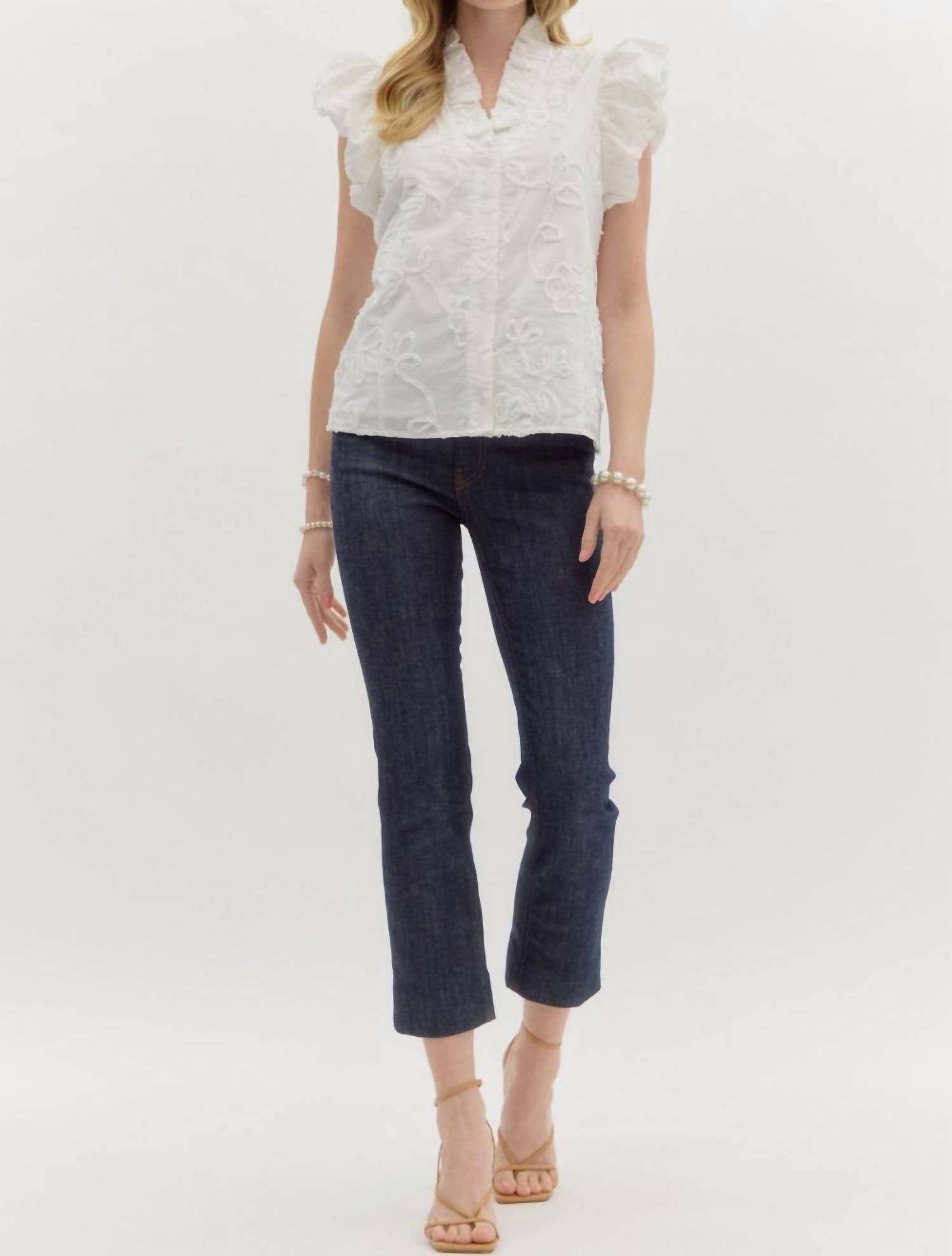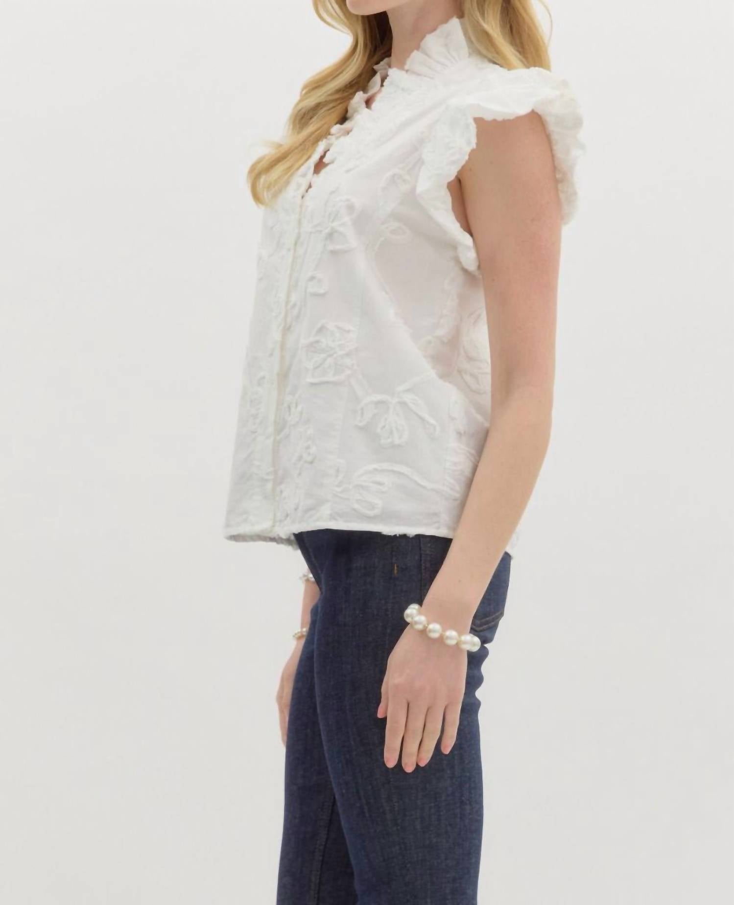 A versatile blouse that works from desk to dinner! Discover the Floral Applique Blouse by Entro, a chic addition to any wardrobe in a timeless off-white shade. Perfect for summer, this cap sleeve top features a delicate floral appliqué and elegant ruffle-accented V-neck for added flair. Made from 100% cotton, it offers the breathable comfort you need on vacation. Closure: Button closure. Care: Hand wash and line dry to maintain its lightweight and textured quality.
