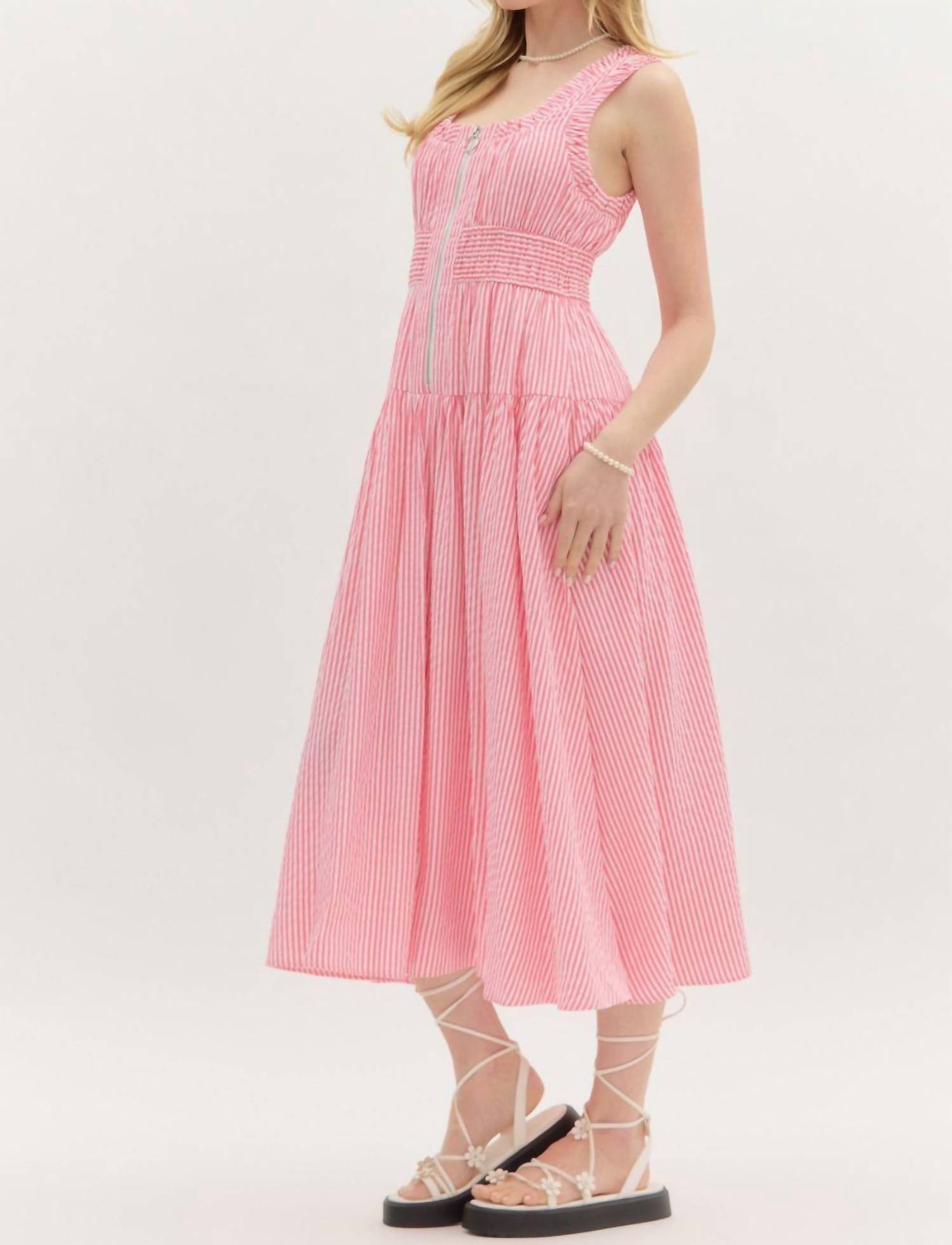 The perfect length dress does exist. Elevate your summer wardrobe with the Freedom Flair Dress by Entro, a sleeveless A-line silhouette perfect for any vacation getaway. Crafted from 60% Polyester and 40% Tencel, this midi dress boasts a playful stripe pattern and a flattering elasticated ruching band around the waist. The gold zip closure at the back adds a touch of glam, while the convenient pockets enhance practicality. Designed in a chic pink hue, its lightweight, non-sheer, and fully lined fabric ensures you stay comfortably stylish.