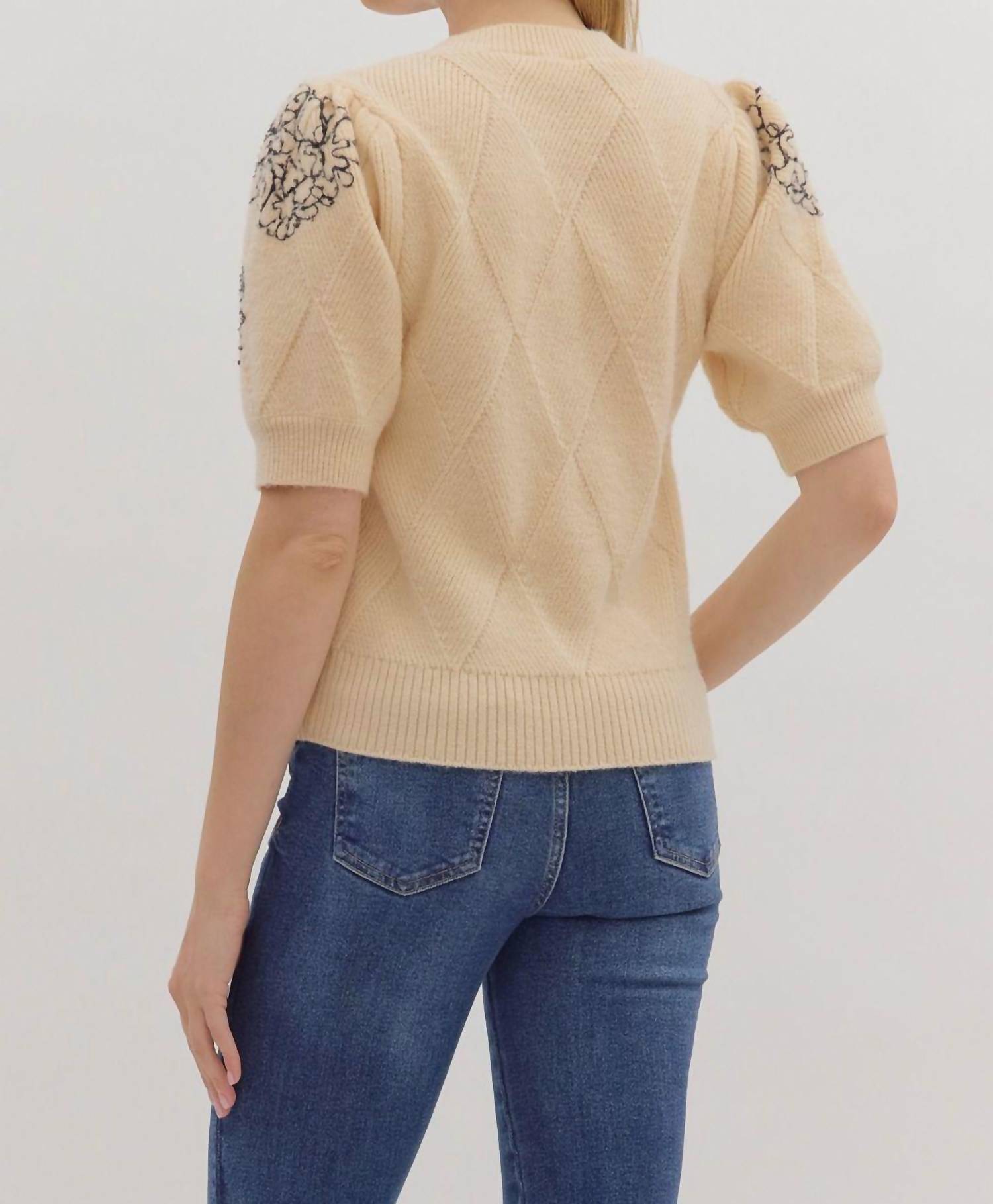 Stay warm and stylish in this versatile and effortlessly cool knitwear staple. Wear it alone or layered, it's the perfect sweater for the season and you'll wish you had it in every color. Elevate your wardrobe with the Short Sleeve Floral Sweater by Entro, a charming blend of sophistication and style in a gentle beige hue. Ideal for spring occasions, this top boasts short puff sleeves and delightful floral embroidery atop a textured diamond knit. Crafted from 48% Acrylic, 32% Nylon, and 20% Polyester, it offers a pull-on closure for effortless wear. Care is a breeze with machine wash instructions and line dry, making it a practical yet stylish choice for your special Thanksgiving or anniversary events.