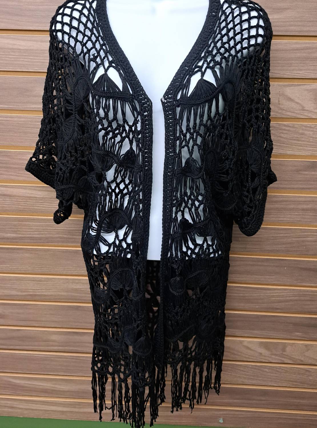 This cardigan will be a sweater-rotation favorite. Introducing the Crocheted Open Work Sleeved Cardigan by Entro, a stunning addition to any summer wardrobe. This women's cardigan features short sleeves and a V-neck, beautifully crafted with a unique patterned crochet design. Made from 100% acrylic, it offers a lightweight feel, perfect for a beach day outing or any casual occasion. Available in classic black, it ensures you'll stand out in style while staying comfortable.