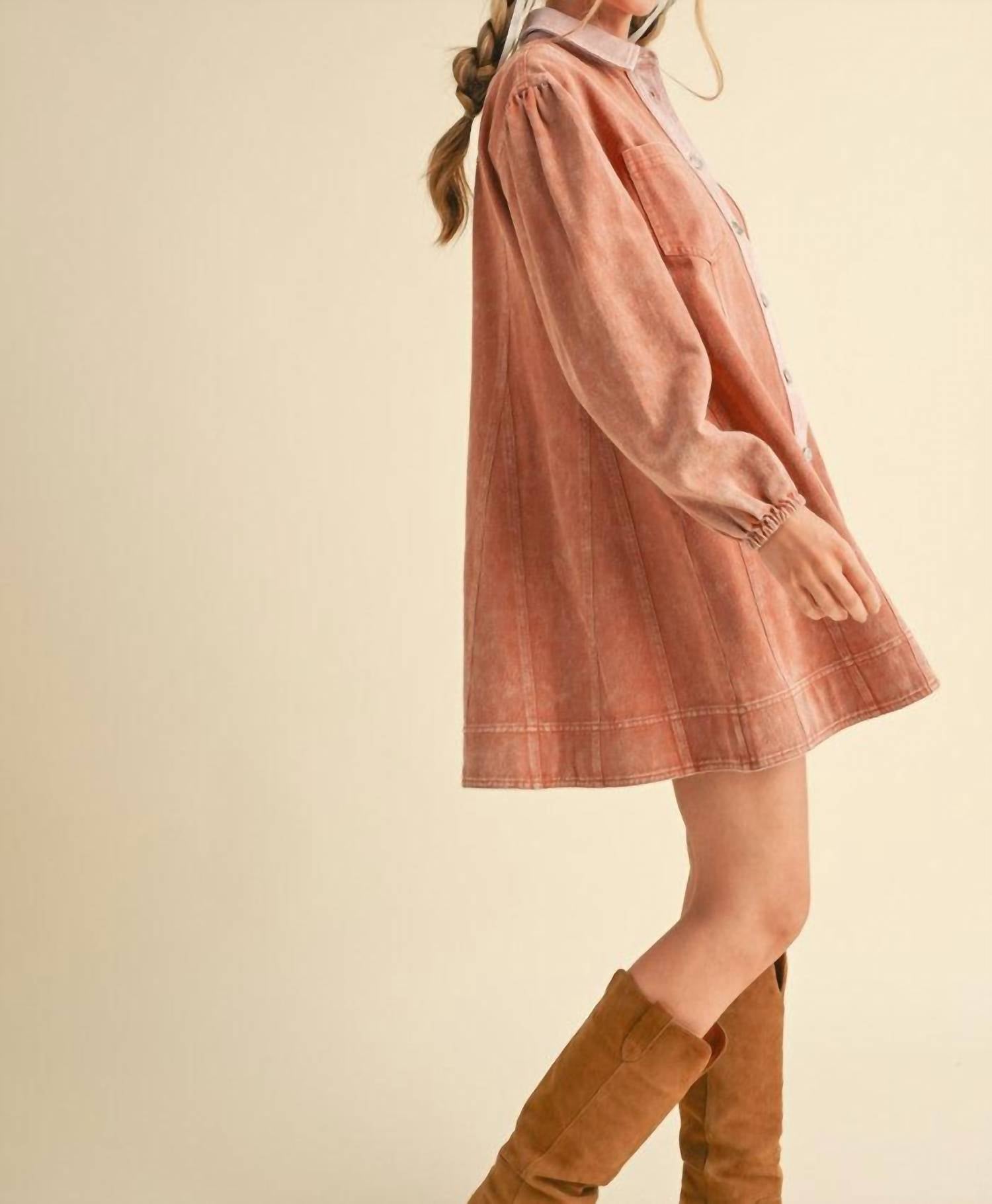 The kind of easy and flattering dress you'll be reaching for all season long. Experience the stylish Edge Line Denim Mini Dress by &merci, a perfect addition for women seeking comfort with a trendy edge. In Terra Cotta, this long sleeve dress is crafted from cotton in a chic shift silhouette, featuring a collar neckline and convenient pockets. The eye-catching design includes contrasting color along the front buttons. Closure type: Button closure. Care instructions include machine wash and tumble dry, making it easy to maintain.