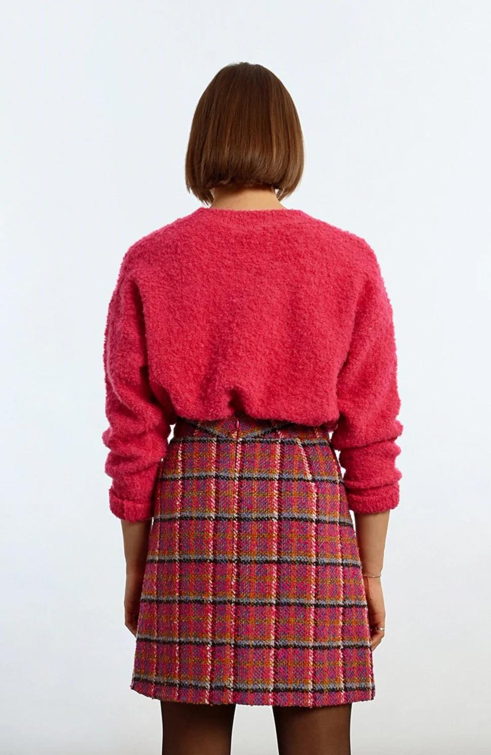 Elevate your spring wardrobe with the Fuchsia Tweed Skirt by MOLLY BRACKEN, a chic plaid piece that embodies the workwear trend. This high-waisted, straight-cut mini skirt is marked with a belt and lined for a flattering fit. Material: Polyester. Closure: Zip closure at the top of the back. Care: Machine wash.