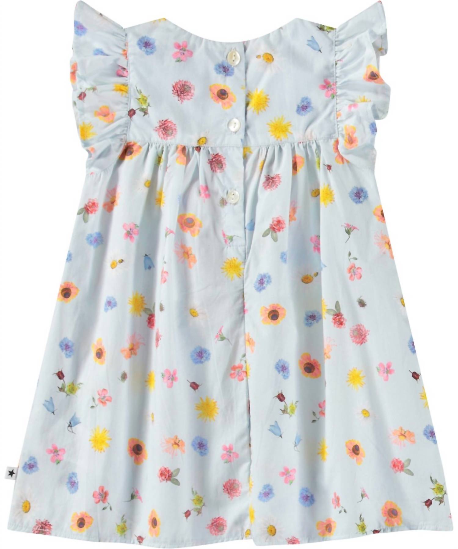Dress your little one in the Molo Girl's Cacao Small Flowers Dress, crafted from organic cotton poplin for a soft, breathable fit. This charming dress features small ruffle sleeves and a high waist, accentuated by a delicate floral pattern in a light blue hue. Closure: Button fastening at the back. Care: Machine wash.