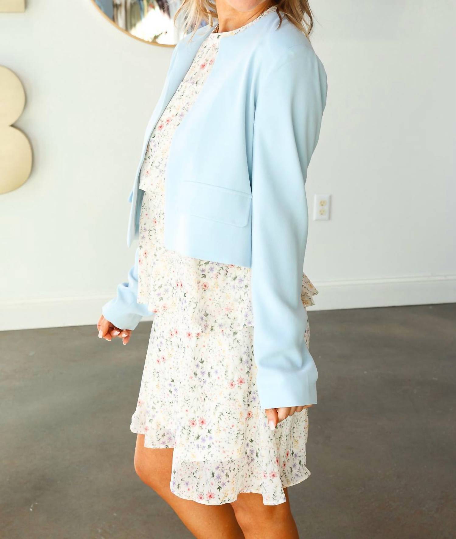 A blazer so versatile you can wear it to the office or pair it with jeans for a more casual look. Embrace elegance with the Serenea Blazer by Steve Madden, ideal for summery celebrations or a stylish Thanksgiving ensemble. This women's blazer, fashioned in a serene sky blue, features long sleeves and an open-front design with chic front flap pockets. Made of 100% polyester, it offers a pull-on closure for effortless wear. The blazer boasts a solid pattern with a garment length of 19.5 inches, showcasing the trend of Quiet Luxury.
