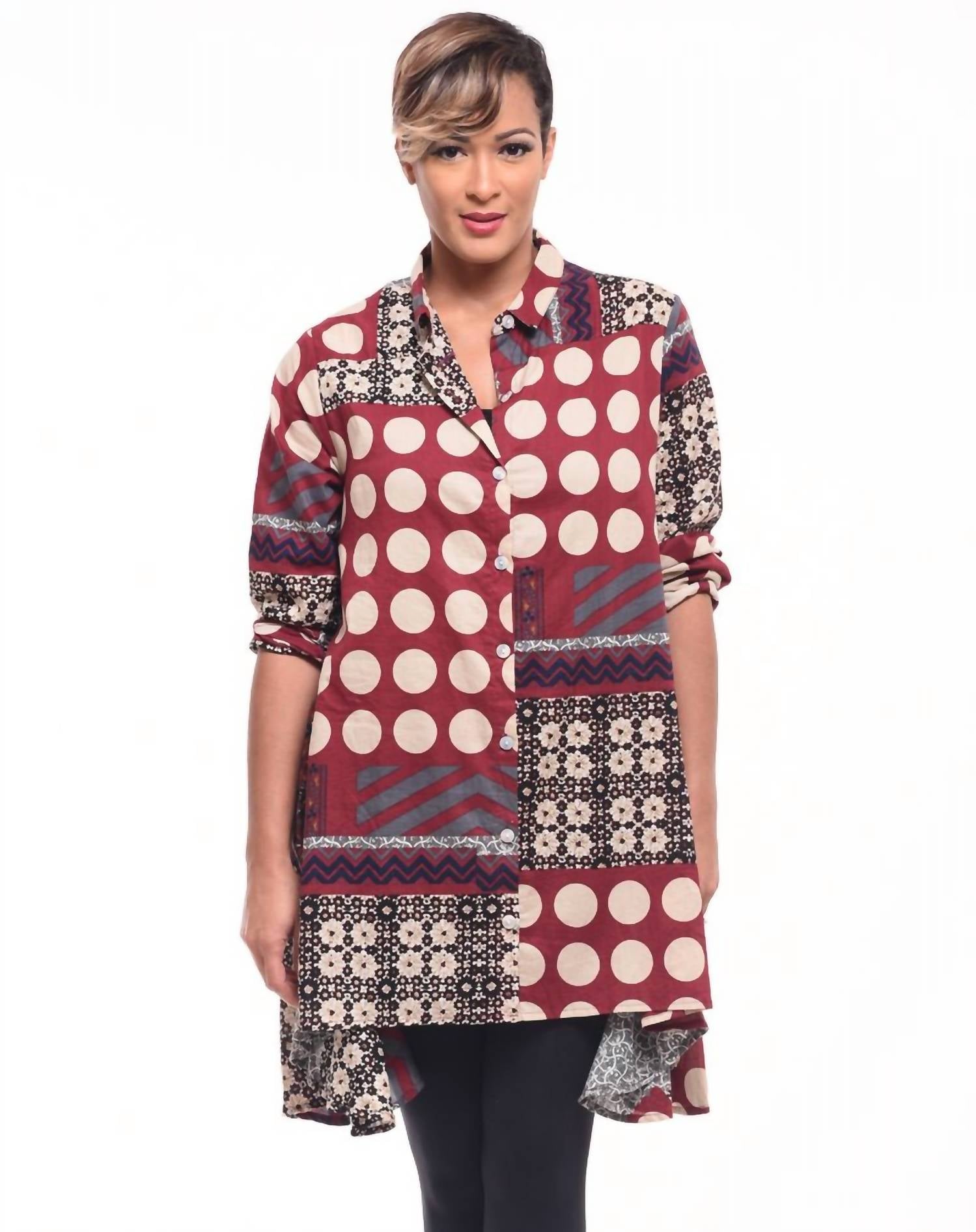 Discover the Gigi Top by Tulip Clothing, a charming choice in Wine Potpourri with playful polka dots. This blouse features long sleeves and a classic collar, expertly crafted from 100% cotton for a comfortable fit. Garment length is 35.5 inches, highlighted by a button closure for easy wear. Maintain its fresh look with machine wash and line dry care instructions.