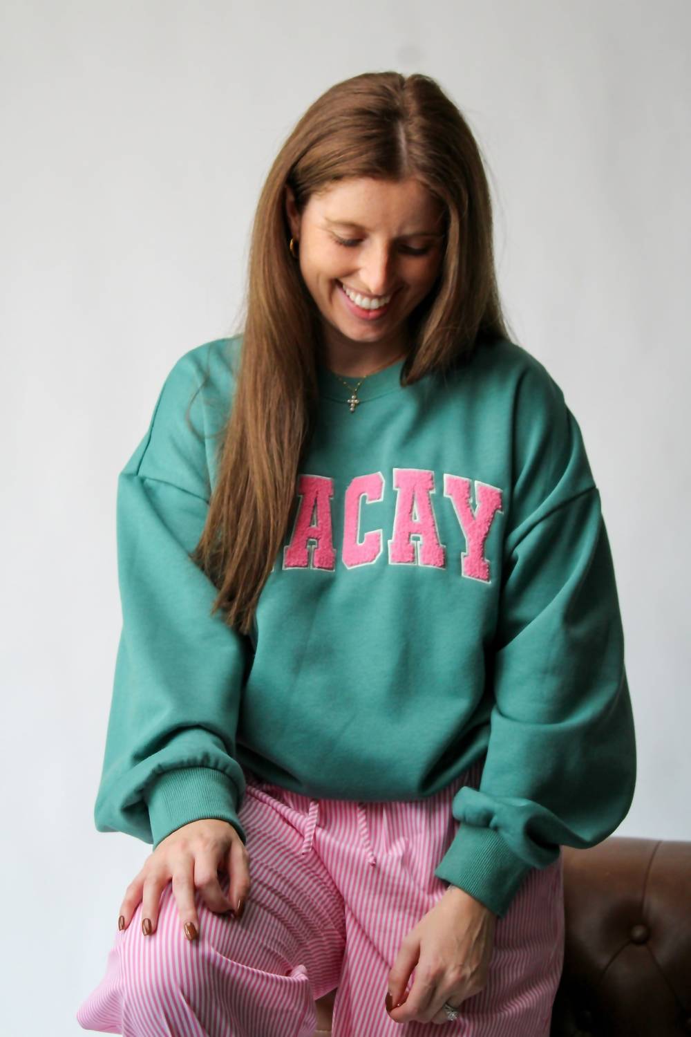Cooler temps call for layering and we love this adorable sweatshirt for all the obvious reasons. Introducing the Vacay Pullover Sweatshirt by WISHLIST, a stylish and comfortable choice for women with a touch of playful charm. This long sleeve teal sweatshirt stands out with vibrant pink graphic patch lettering. Crafted from a soft blend of 77% Polyester and 23% Cotton, its pull-on design and relaxed fit ensure all-day comfort. Perfect for a cozy winter day, simply machine wash to keep it ready for your next adventure or housewarming.