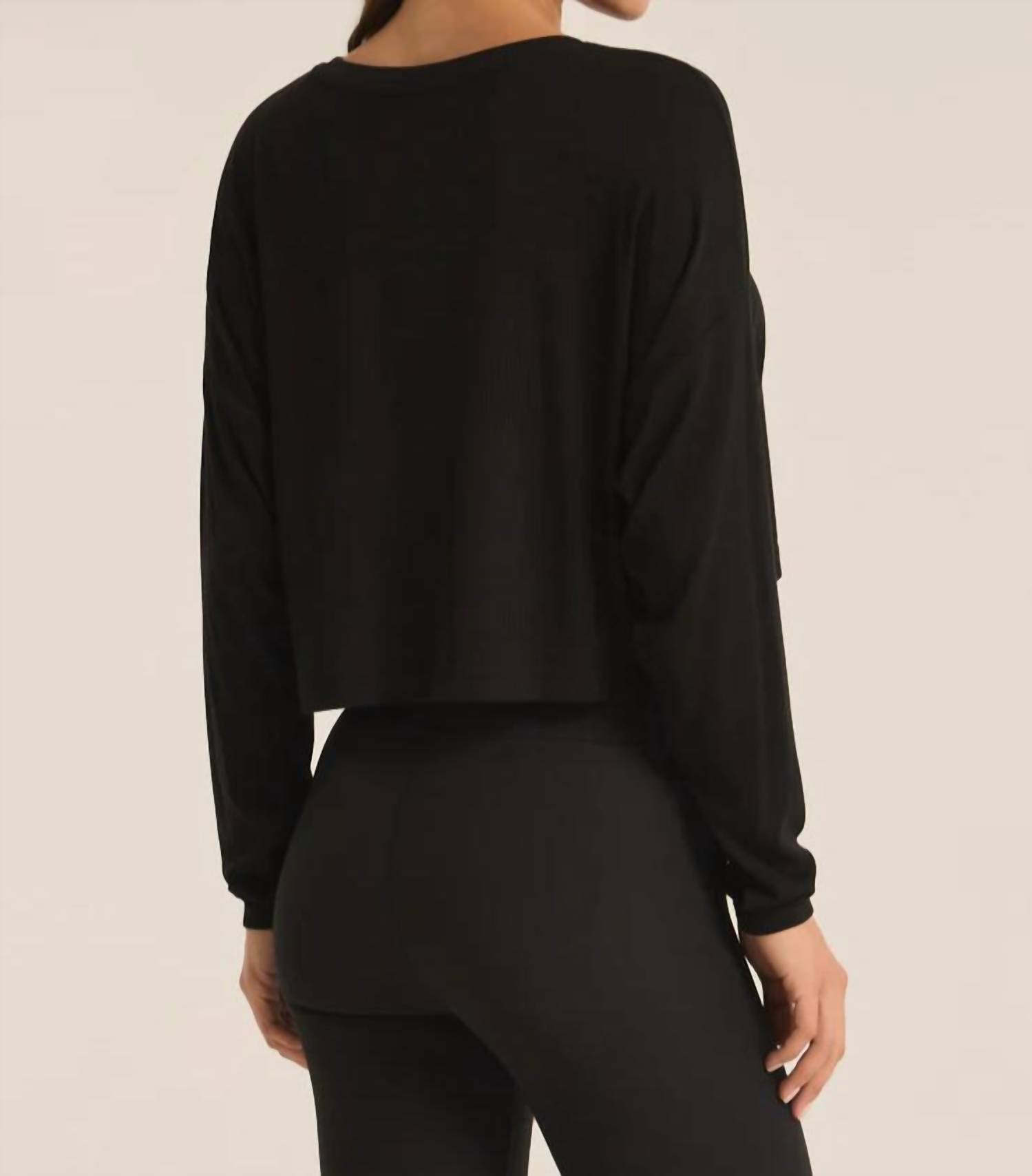 A chic black cropped top featuring long sleeves and a crewneck, made from a comfy 95% Rayon and 5% Spandex blend. Its effortless pull-on style and dropped shoulders make it ideal for relaxed occasions.Machine wash cold on a gentle cycle, lay flat or hang to dry, and avoid softeners.