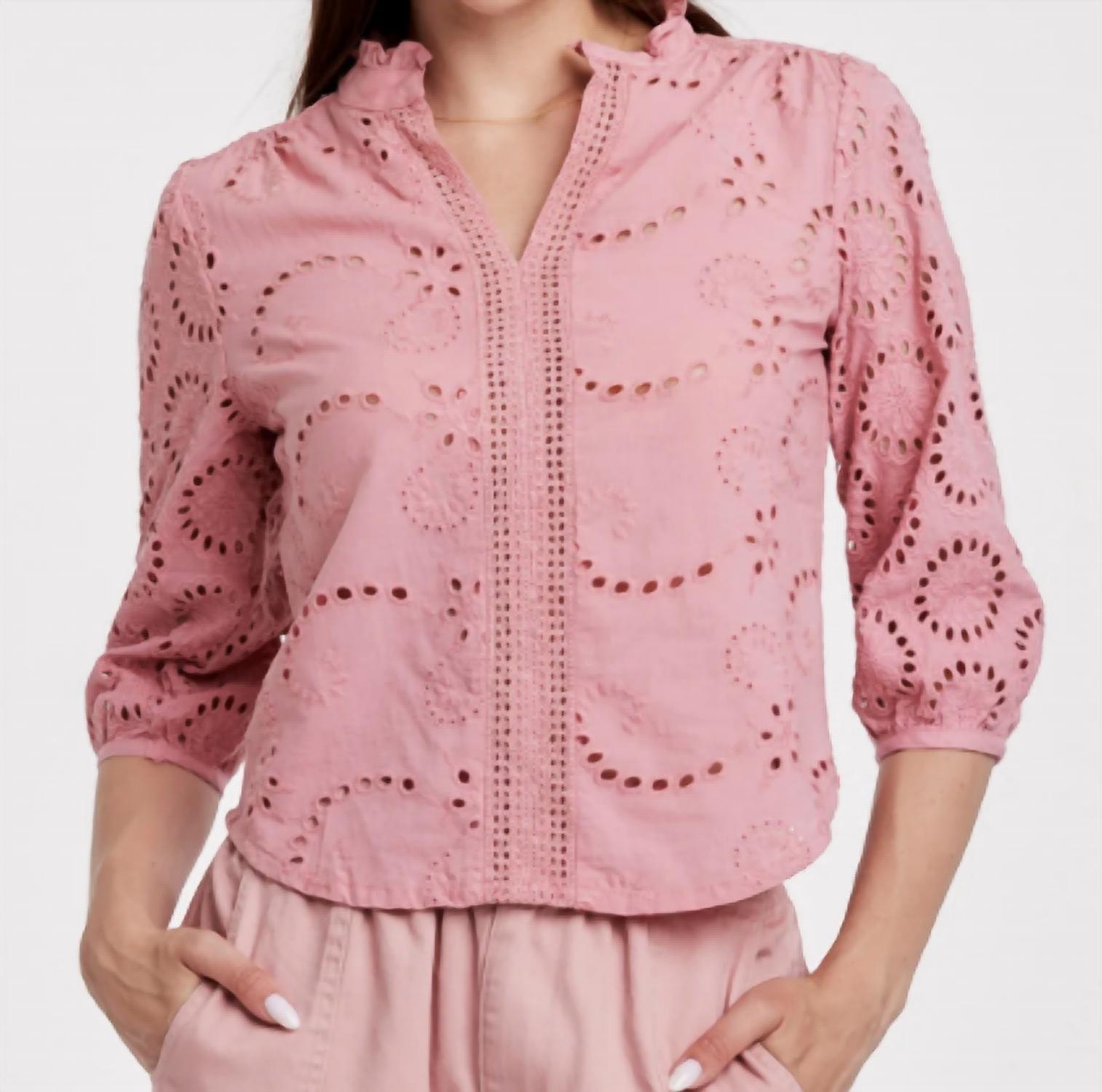 A versatile blouse that works from desk to dinner! Introducing the Alexandria Eyelet Blouse by Another Love, a timeless piece in a beautiful cherry hue designed to elevate your style. This women's blouse features a V-neck with an elegant ruffle neckline and three-quarter sleeves for a chic and feminine look. Closure is a convenient pull-on style, while care is made easy with machine wash and tumble dry instructions. Perfect for summer engagements, this blouse is as versatile as it is stylish.