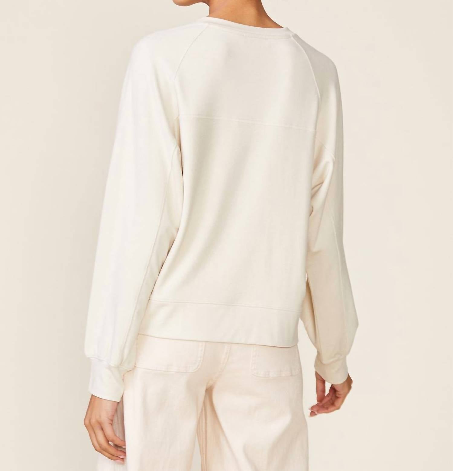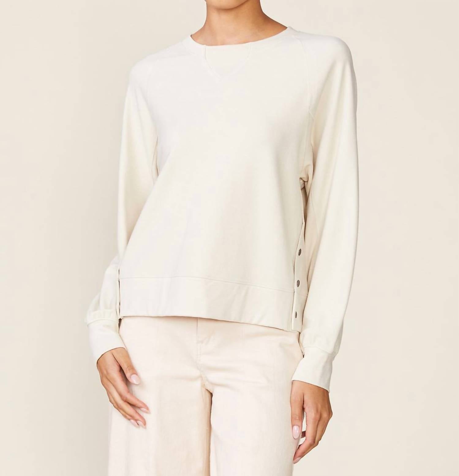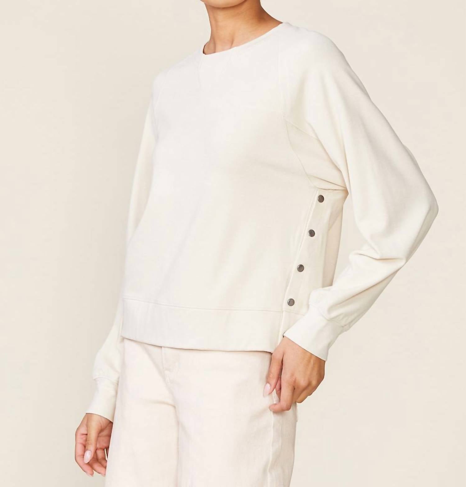 Enhance your wardrobe with the Raglan Pullover With Side Snaps Top by Anthem the Label, perfect for a minimalist fall look. This almond-colored, long-sleeve pullover features a crewneck design, making it ideal for Thanksgiving or a vacation. Crafted with a solid pattern, it offers a stylish yet relaxed vibe. For maintenance, simply machine wash and line dry.