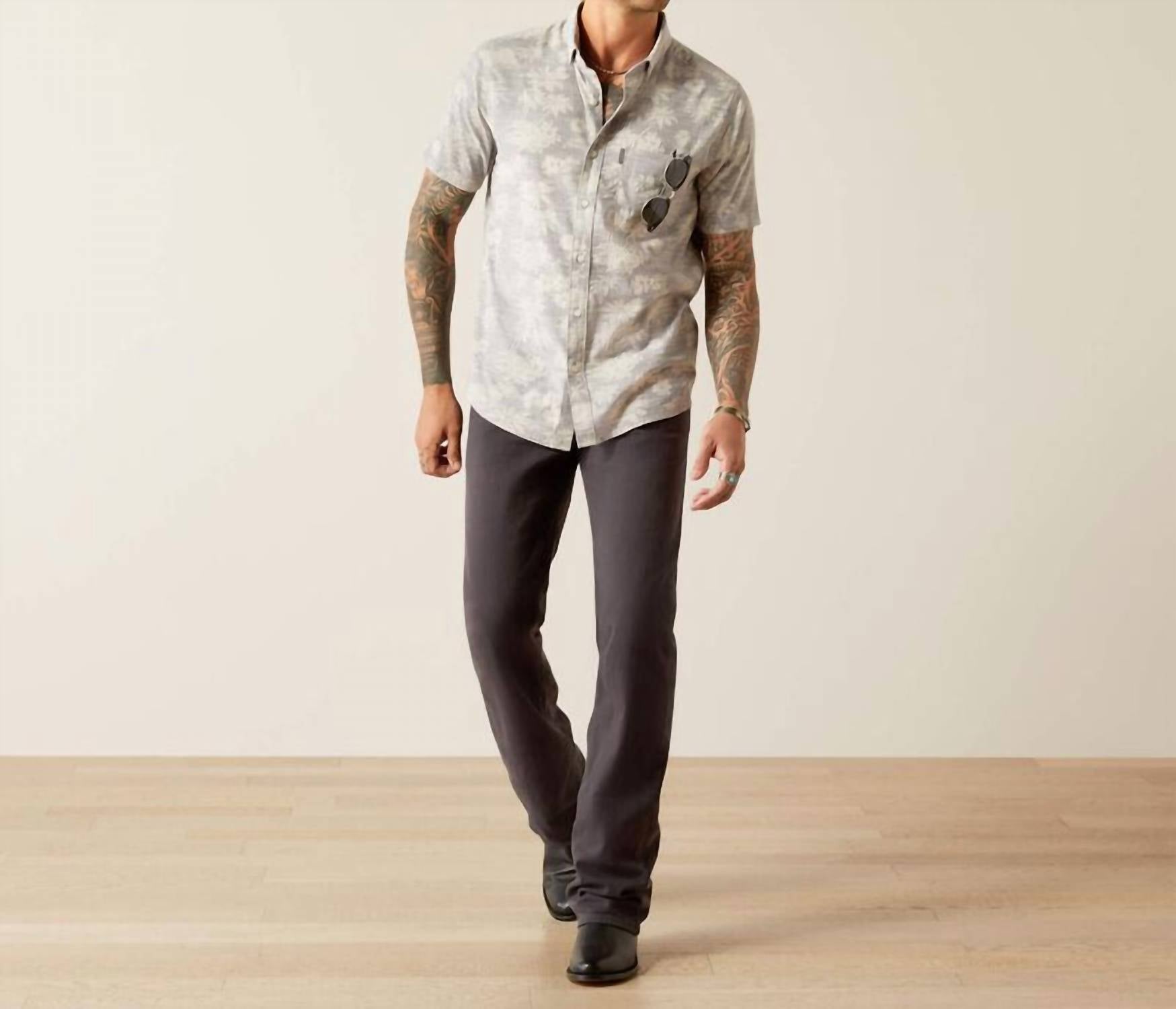 Elevate your casual wardrobe with the Morris Modern Fit Shirt by ARIAT, crafted in soft, 100% cotton for optimal comfort. Featuring short sleeves and a flattering slim fit with a slightly shorter hem, this shirt showcases a charming floral pattern in a versatile grey hue. Its thoughtful design includes adjustable cuffs with extended button details, a hidden pen slot in the left pocket, and a button-front closure with buttoned collar points. Enhanced with Performance Stretch, it's prewashed to minimize shrinking, ensuring you stay stylish and put-together throughout summer. Care: Machine wash.