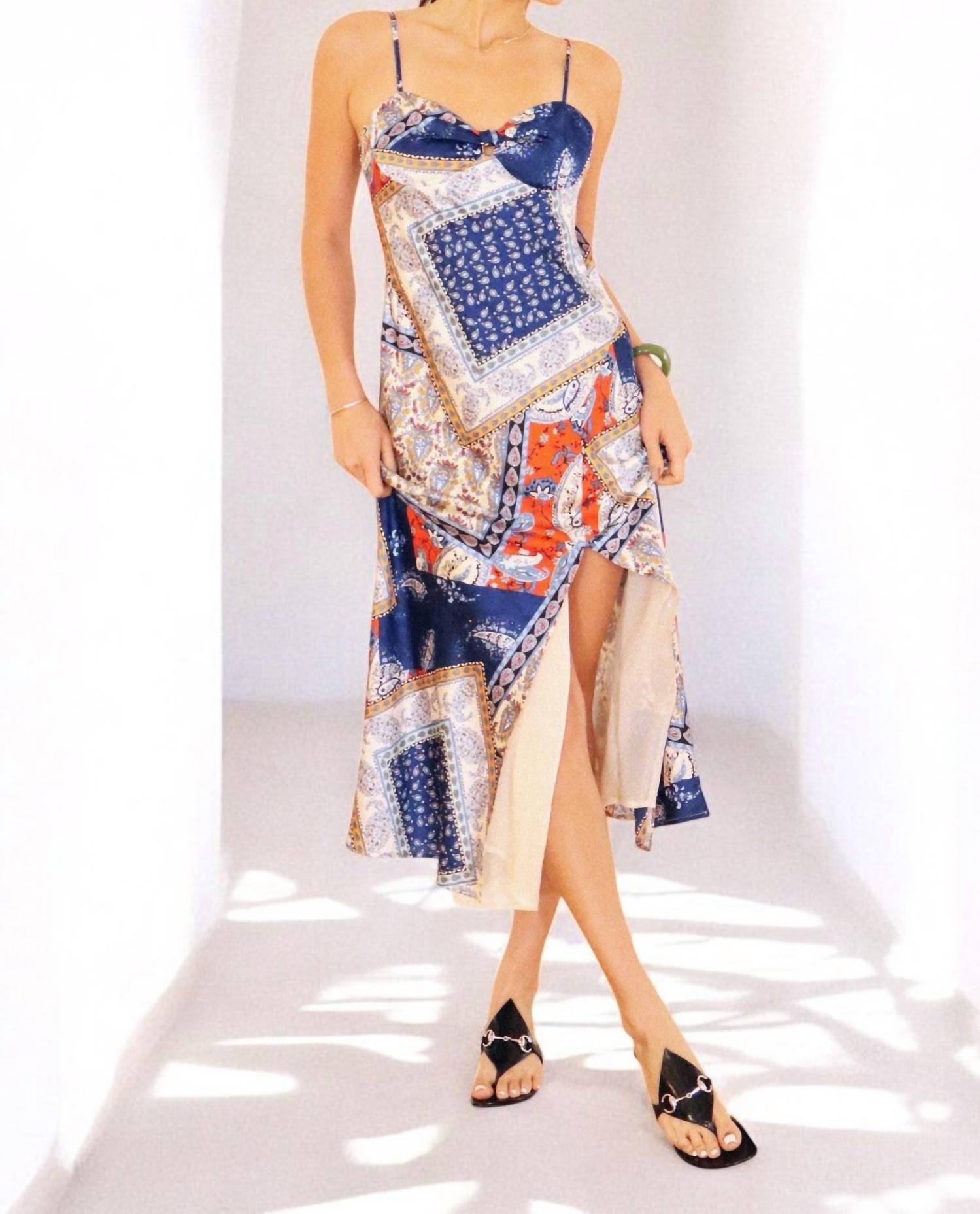 Just add slides or mules and you are good to go. Embrace boho chic with the Paisley Patchwork Midi Dress by Bailey Rose, a stylish choice for evening events or a New Year's Eve celebration. This women's sheath dress features spaghetti straps and a charming sweetheart neckline in a vibrant multi-colored paisley and bandana print. Made from 100% polyester, it offers an adjustable fit with a side zipper closure, complemented by a fresh open back and a side slit for added flair. Ideal for spring, pair it effortlessly with sandals, heels, or cowboy boots to complete your look.