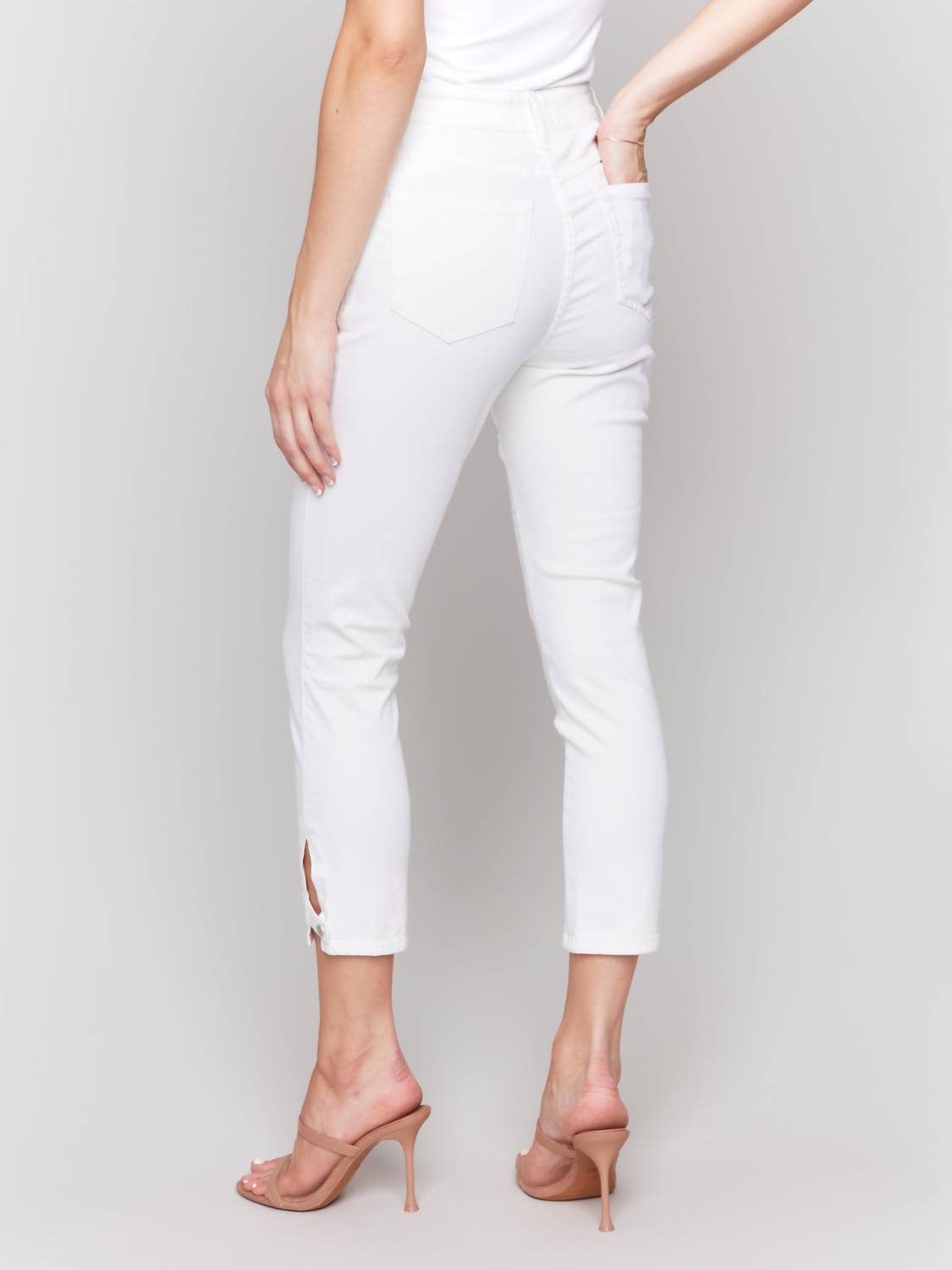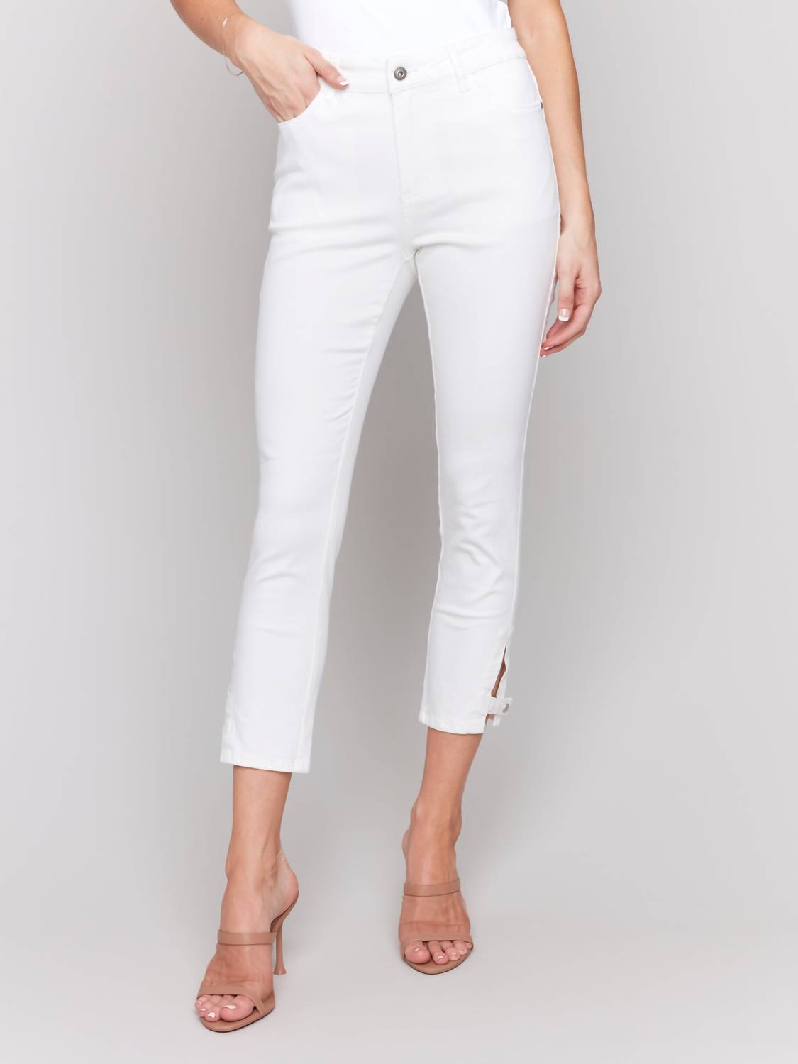 A straightleg pant that workes season after season. Dress these up with your favorite blouse or keep it casual with your go-to tee. Elevate your summer wardrobe with the Side Tab Slim Cropped Pants by CHARLIE B, a perfect piece in solid white. These pants boast a cropped length and feature a regular rise, with measurements of a 26-inch inseam and a 6-inch leg opening, delivering a sleek slim fit. Crafted from a cotton blend of 98% cotton and 2% spandex, they incorporate a side mini tab detail, a five-pocket design, and a convenient zip closure. Care is made easy with machine wash instructions and laying flat to dry, providing a comfortable and stylish option for any concert or streetwear occasion.