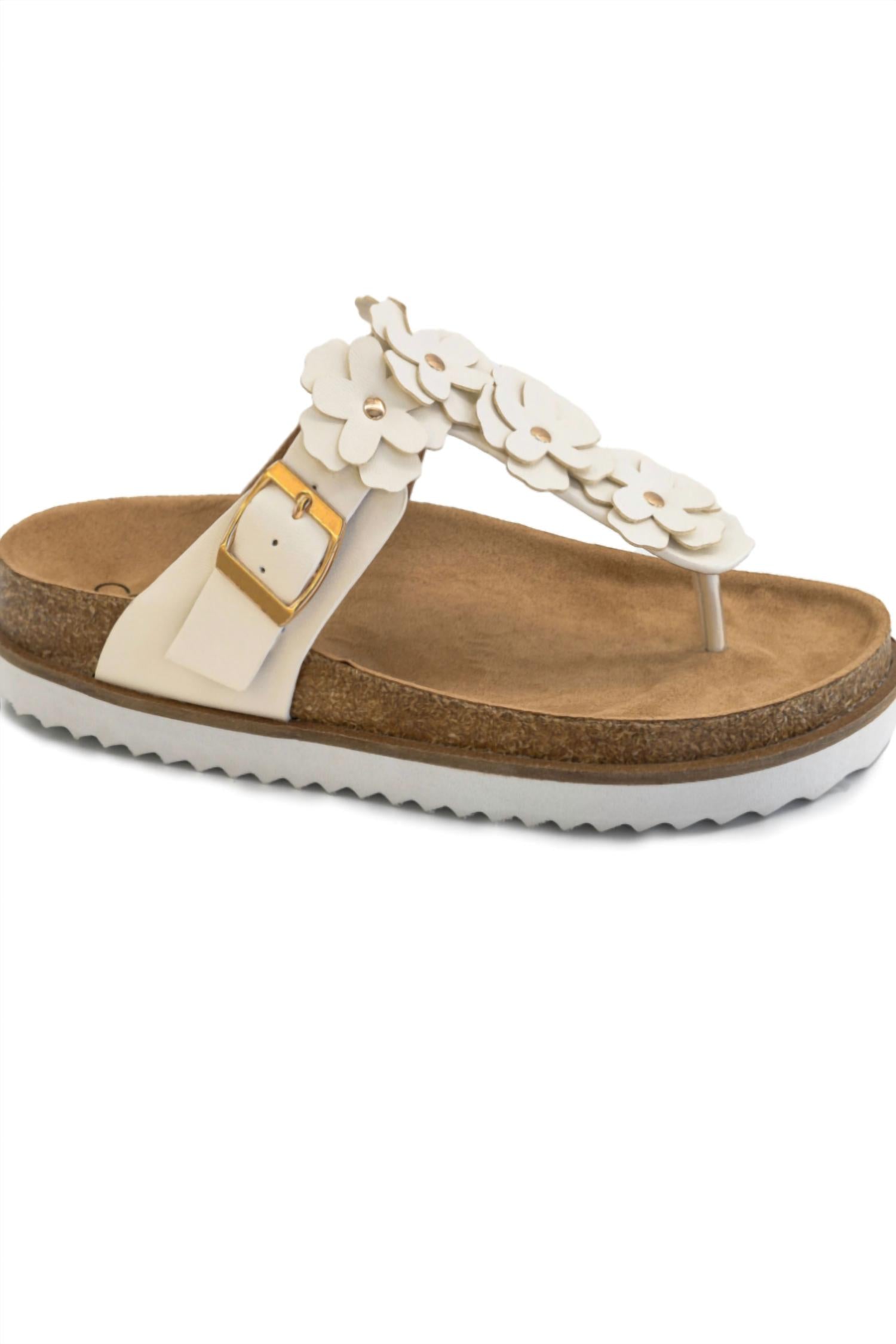 Flowy dresses, cropped pants, and even jumpsuits... this sandal works with them all! Step into summer with Corkys Footwear Women's Bless Her Heart Sandal, perfect for adding a boho chic flair to your vacation outfits. These sandals in elegant white are adorned with eye-catching 3D flowers and feature an adjustable buckle for a customizable fit. Designed with an open toe and flat heel, they provide comfort and style throughout your day. Made for women and ideal for half sizes to size up.