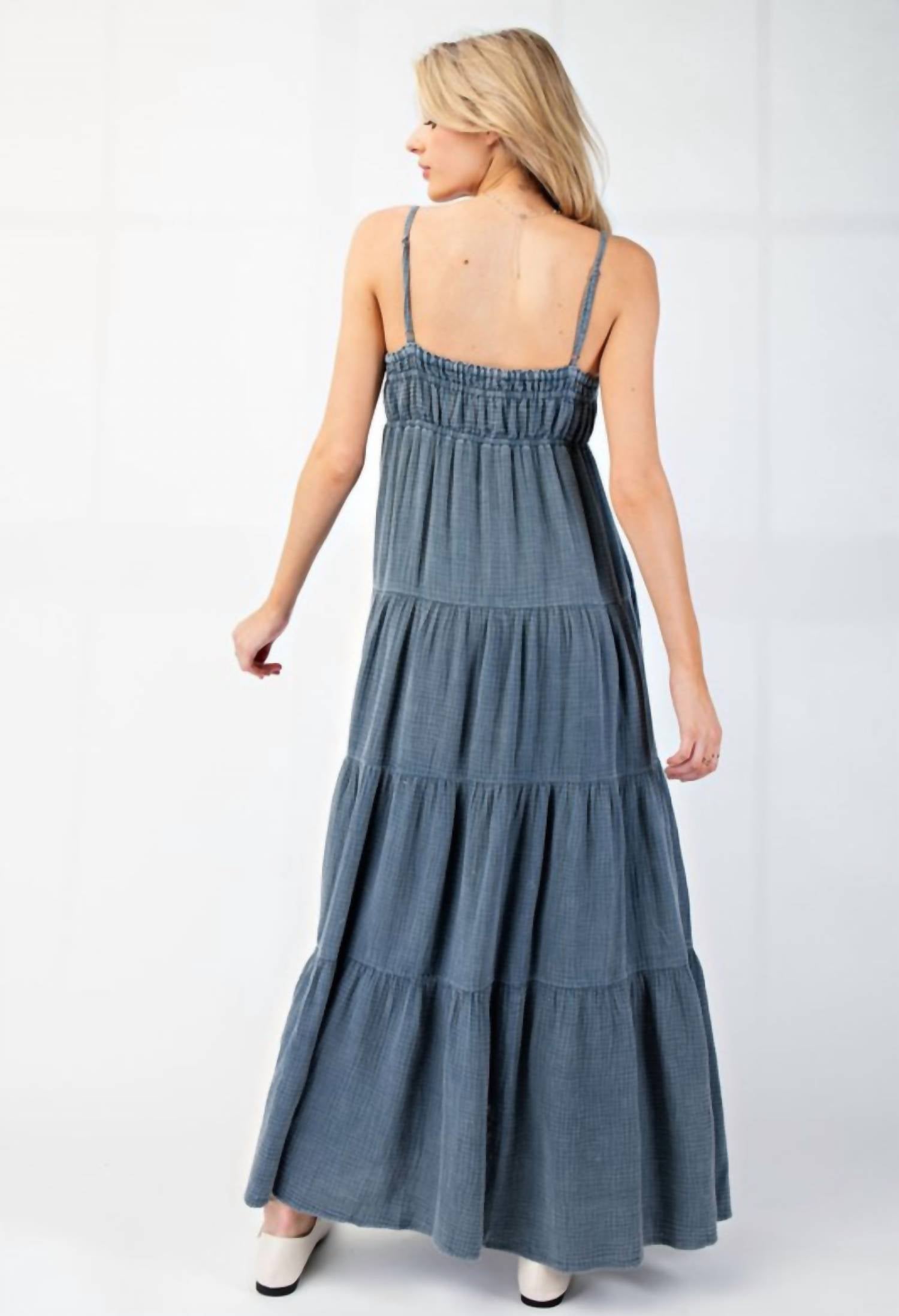 Style this maxi with your favorite statement necklace and sandals for the perfect look. Stay effortlessly chic this summer with the Easel Good Feelings Maxi Dress in Washed Denim, styled with adjustable spaghetti straps and a flattering squareneck. Made from 100% cotton, this solid, empire waist maxi dress offers a tiered and ruched bottom with a smocked front for added style, and side pockets for practicality. Its pull-on closure and relaxed, loose fit ensure comfort from day to night, making it perfect for casual occasions like a housewarming or 4th of July celebration. Embrace the boho chic trend while enjoying the carefree vibes of this beautiful piece.