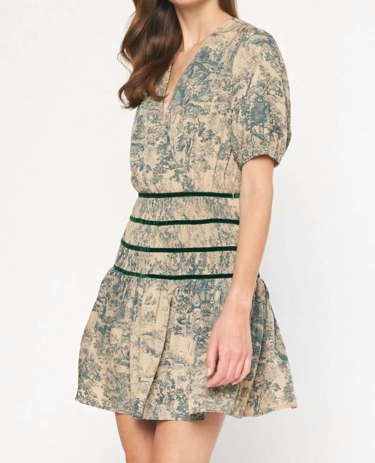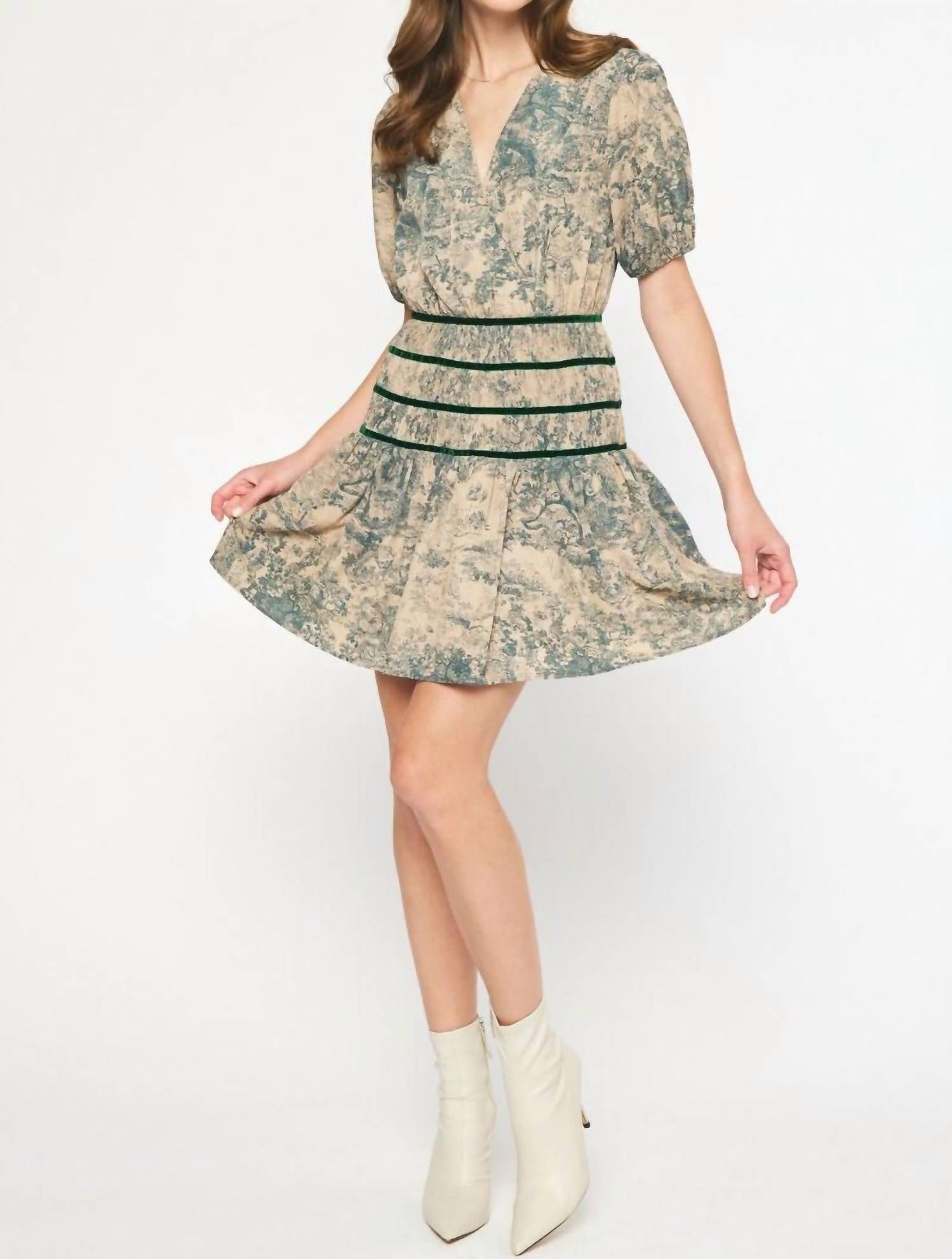 Step into sophistication with the Forest Toile Mini Dress by Entro, a boho chic must-have for seasonal gatherings. This A-line mini dress features short sleeves and a beautiful graphic pattern in lush forest green. Made from soft cotton, it offers a pull-on closure for easy wear. To maintain its charm, hand wash and line dry as needed. Model is wearing a size small, and the dress fits true to size, making it perfect for Thanksgiving and birthday festivities.