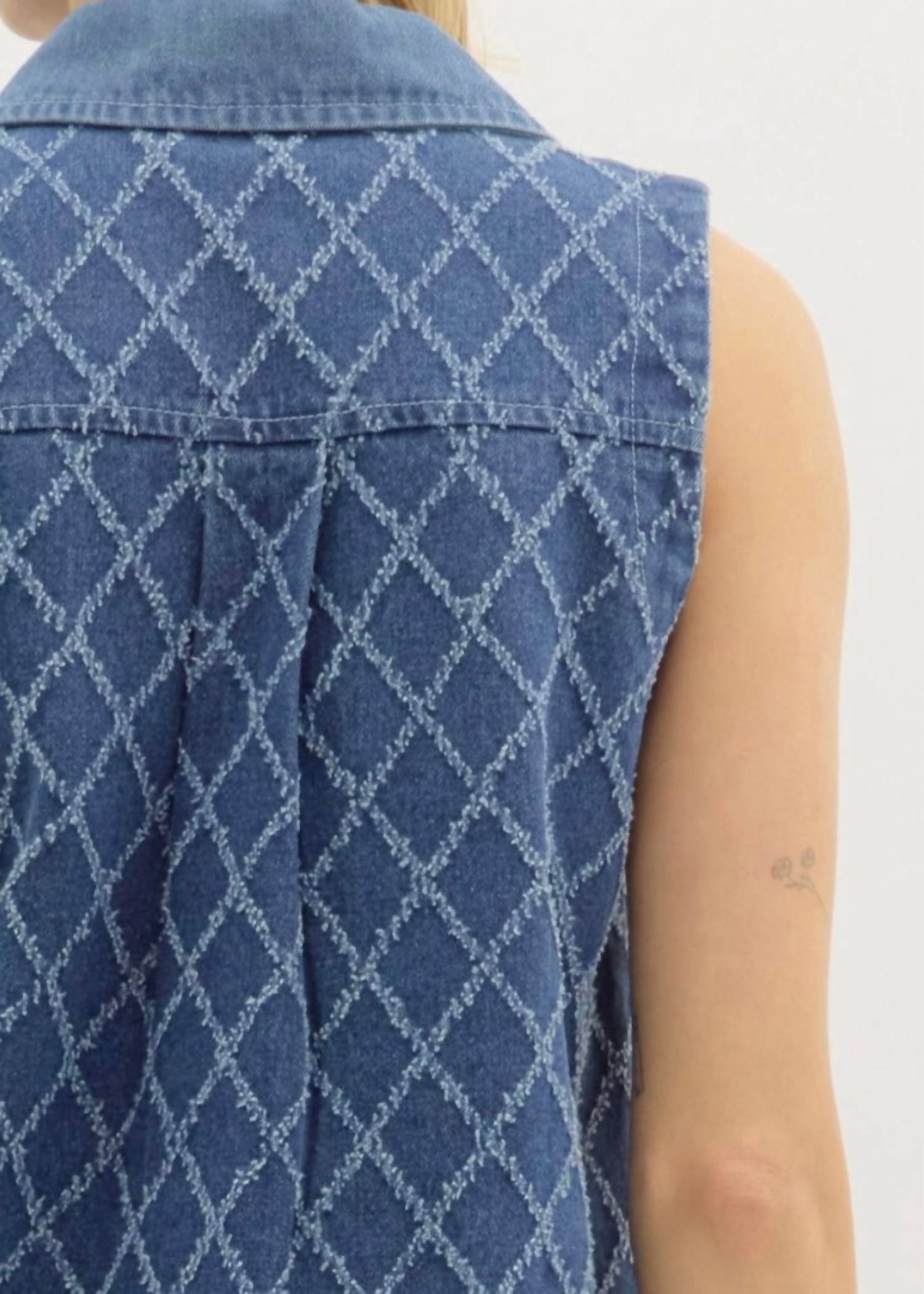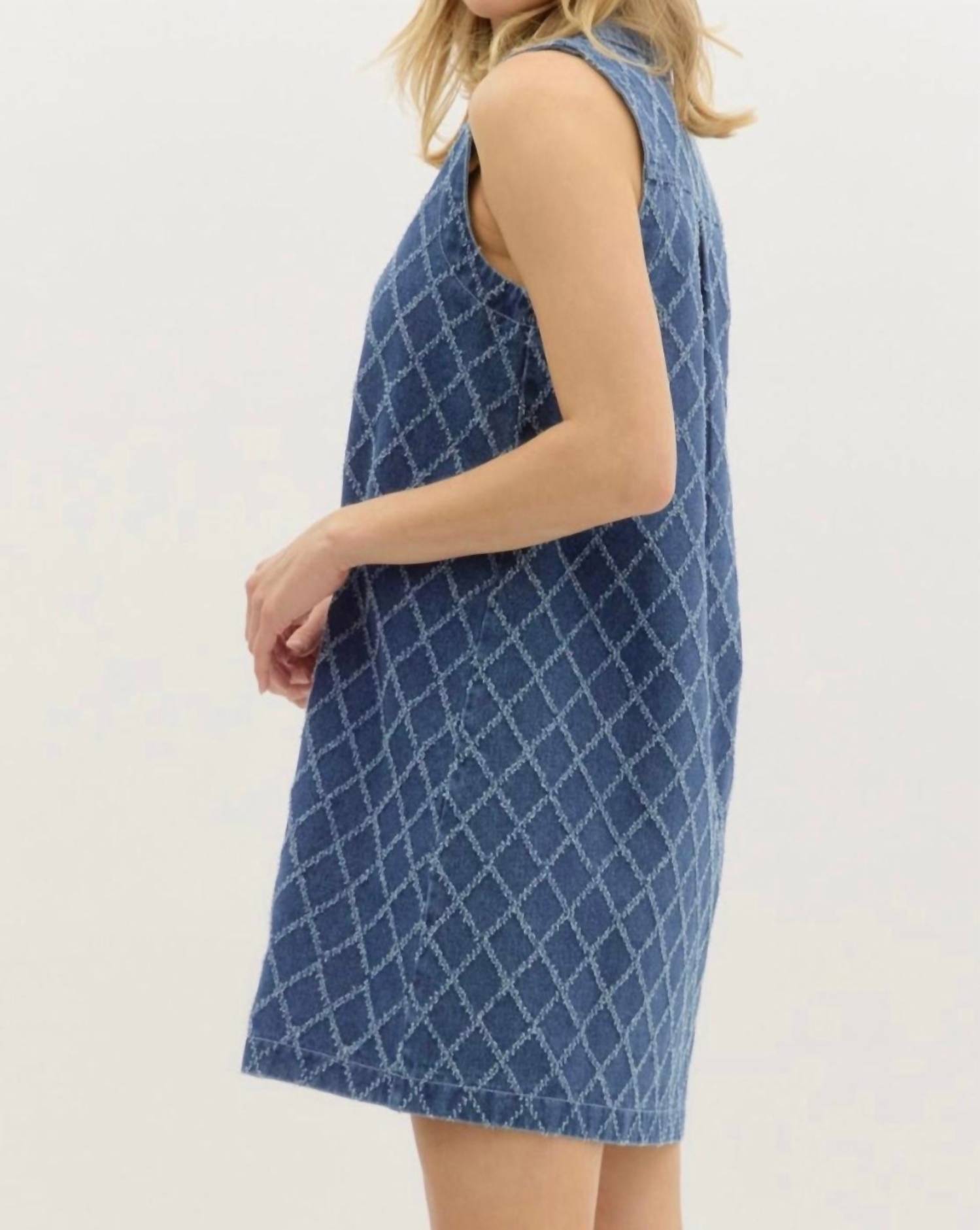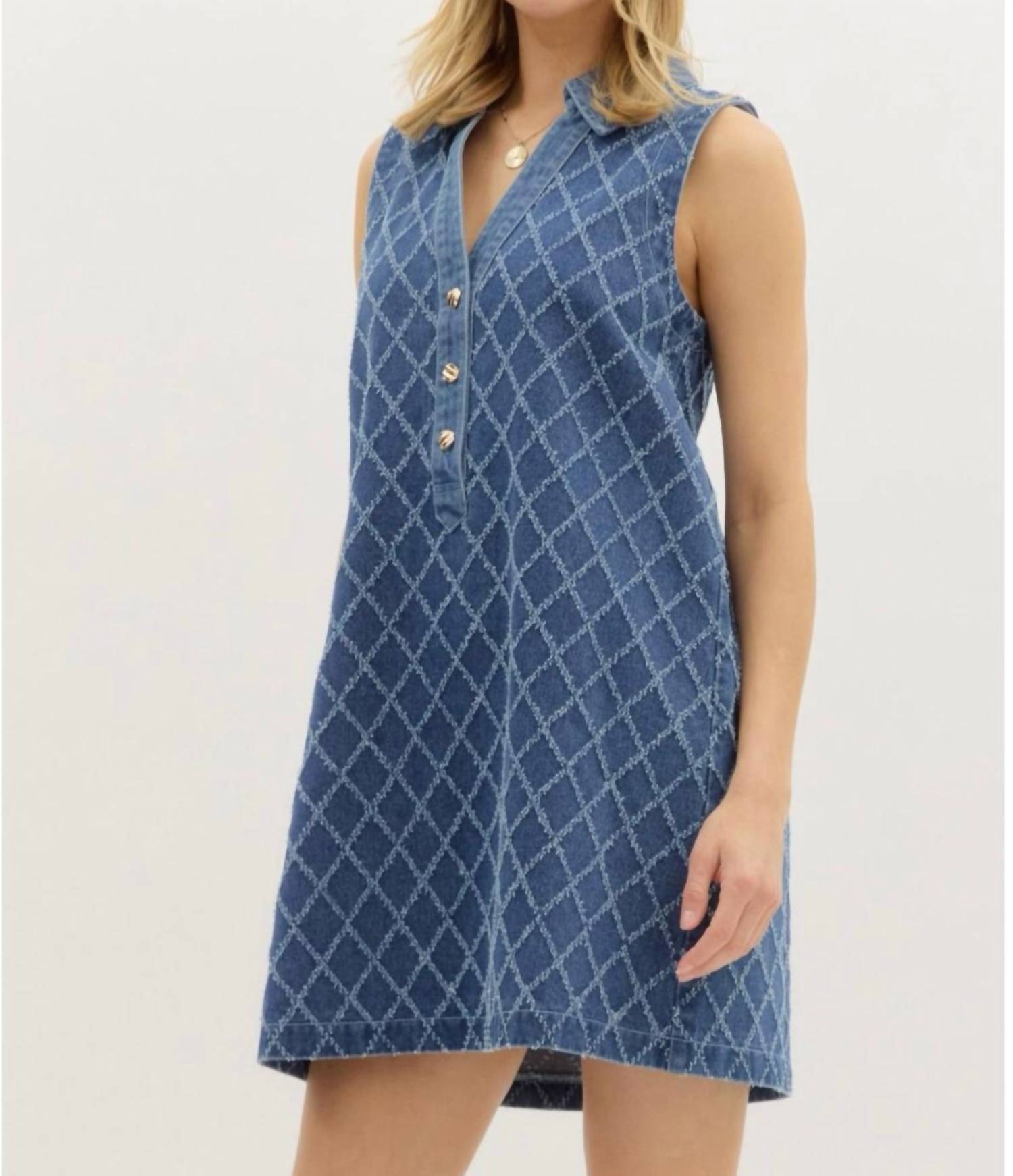 The kind of easy and flattering dress you'll be reaching for all season long. Introducing the Maddy Denim Mini Dress by Entro, a chic and comfortable choice for your warm-weather wardrobe. This sleeveless shift dress features a unique diamond pattern and distressed detailing, highlighted by a spread collar with gold button closure for an elegant touch. Made from a Cotton Blend composed of 85% Cotton, 10% Polyester, and 5% Viscose, this non-sheer and lightweight dress ensures all-day wearability. Care instructions recommend machine washing and line drying to maintain its minimalist appeal. Model is 5'10" and wears a size small.