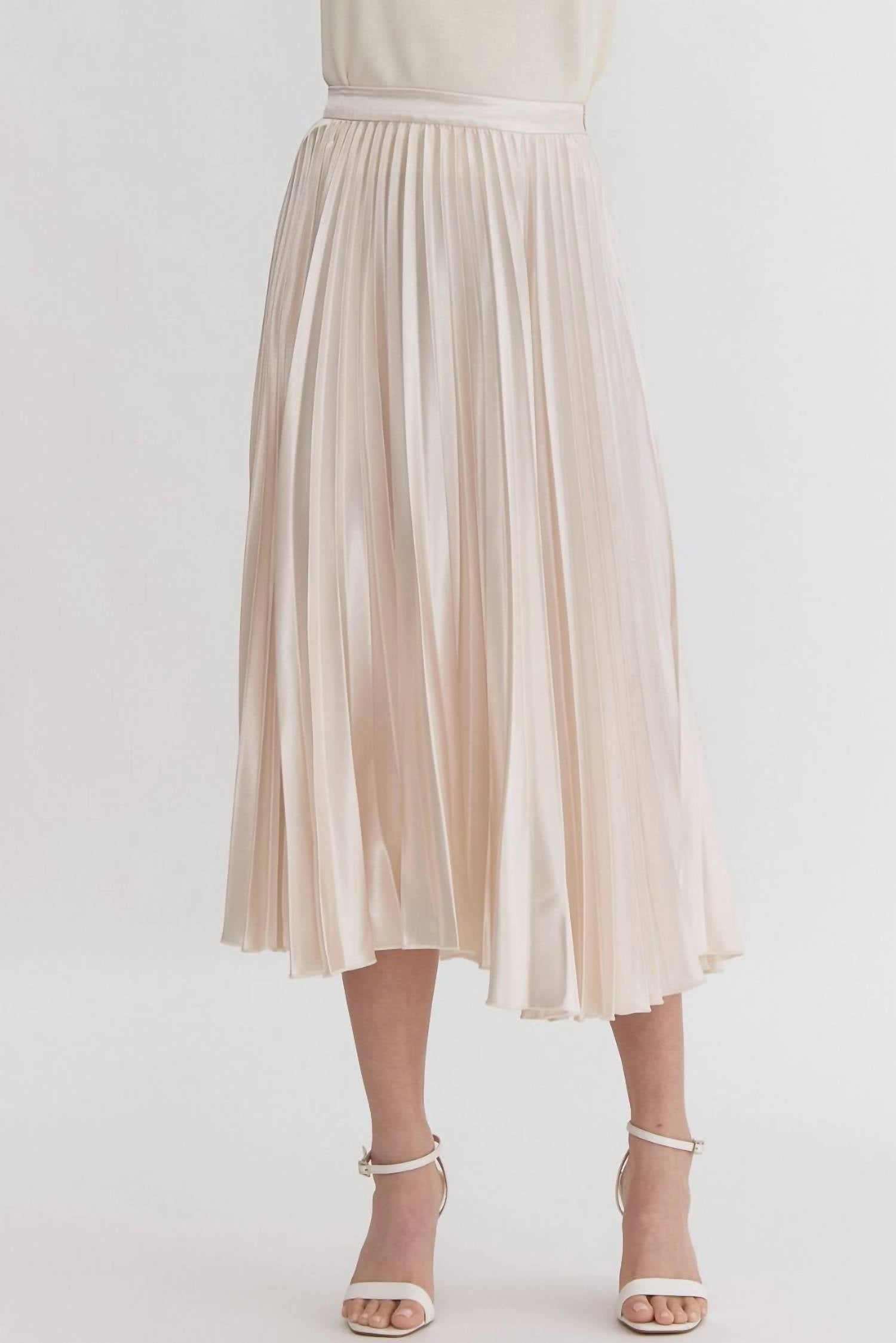 Tuck your favorite tee into this midi length skirt for an effortlessly cool look. Elevate your spring wardrobe with the Pleated Midi Skirt by Entro, a stylish blend of sophistication and playful charm in a champagne hue. This striped midi-length skirt is crafted without pockets and features a sleek zip closure for a streamlined silhouette. Perfect for vacations, it effortlessly transitions from day to night, pairing beautifully with both heels and sneakers. Embrace the trend of quiet luxury with this elegant piece made for the modern woman.
