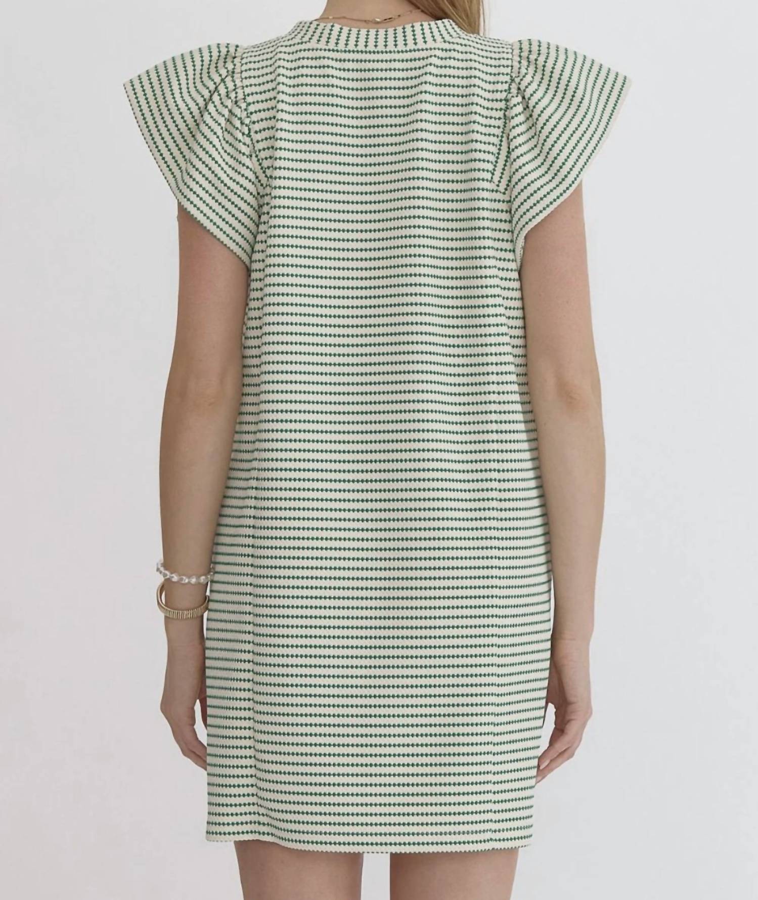 A short and breezy dress for those warmer days. Step into style and comfort with the Entro Green Willow Striped Shift Dress. This chic mini dress features short flutter sleeves, crafted from breathable cotton with a striking green and white stripe pattern. The V-neck design and convenient front pockets enhance its casual elegance, perfect for a dinner party or Thanksgiving gathering. Easy to wear with a pull-on closure, it supports a hassle-free lifestyle with machine wash and tumble dry care instructions.
