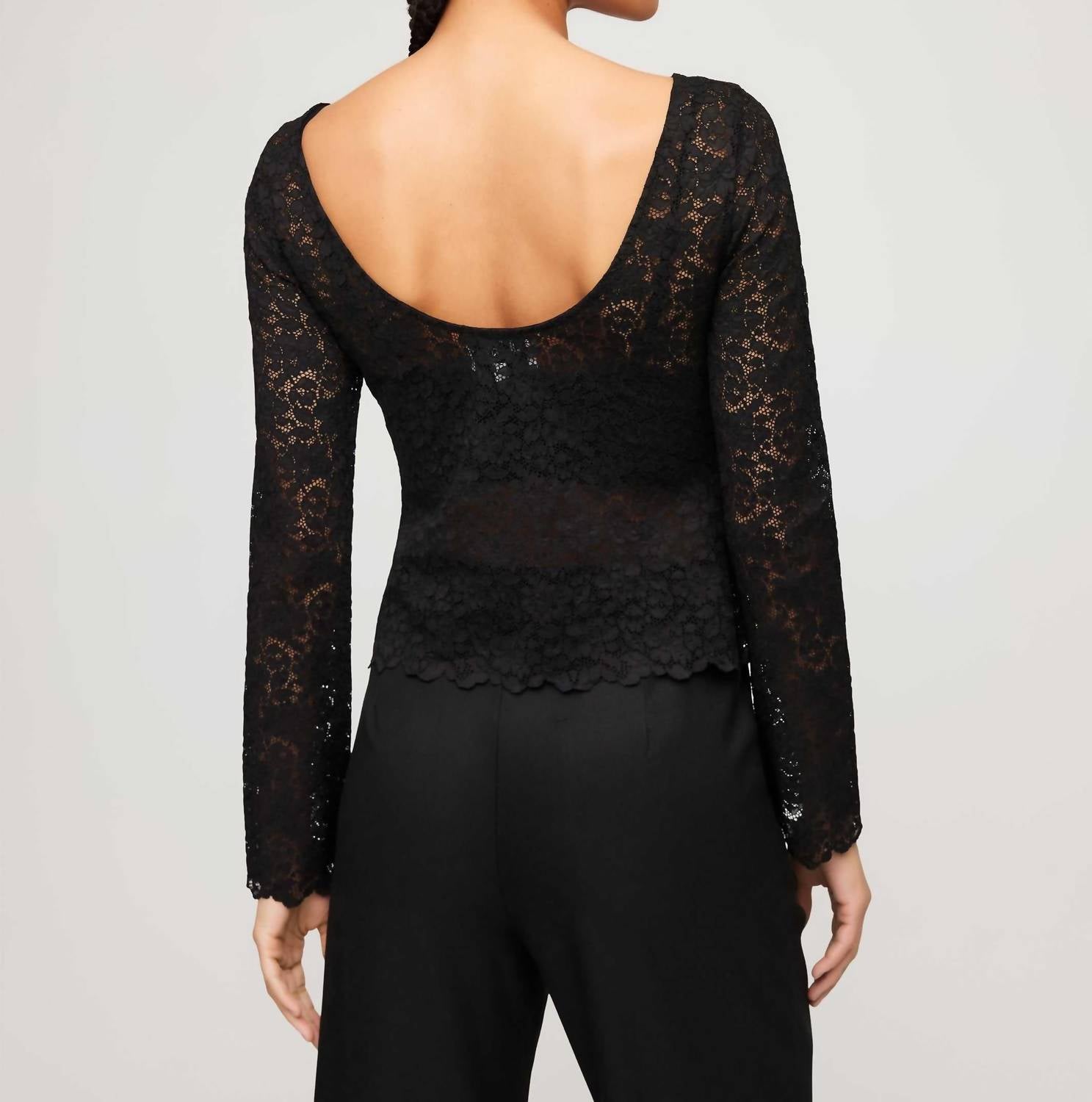 A versatile blouse that works from desk to dinner! Elevate your wardrobe with the Loren Scoop Back Top by Fifteen Twenty, a perfect blend of elegance and comfort in classic black. This blouse features long flare sleeves and a unique boatneck with a captivating back scoop neck, crafted from 88% Nylon and 12% Elastane stretch lace. Measuring 20 inches in length for size S, it’s made in the USA with imported fabric. Closure: Pull on. Care: Hand wash cold, hang to dry or dry clean, making it ideal for holiday parties and boho chic summer outings.