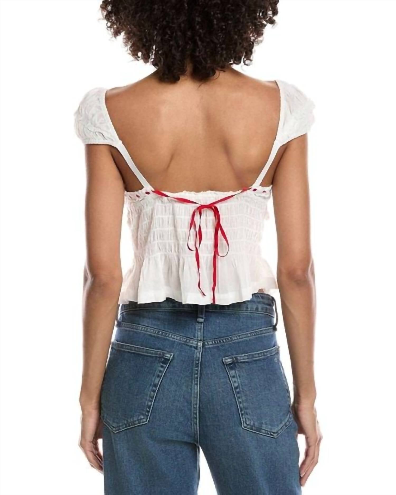Pair this crop top with your favorite high-waisted jeans or maxi skirt. The Sweet On You Crop Top by Free People is a charming addition to your collection, showcased in a fitted, cropped style ideal for summer and Valentine's Day events. This crop top features short sleeves, highlighting a scoop neckline with ruching at the bodice and a contrast ribbon detail at the back. Made from 100% cotton with a touch of stretch from polyester and spandex, it offers comfort and style. Closure: Pull on. Care instructions recommend hand washing and line drying to maintain its boho chic appeal.