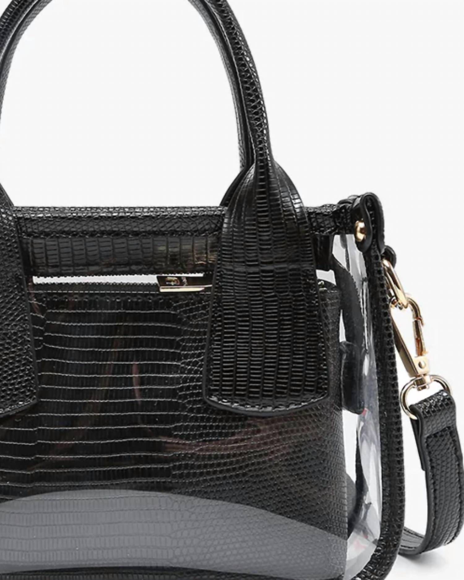This crossbody bag will be your go-to bag of the season. Introducing the Women's Stacey Clear Satchel by Jen & Co., a stylish and functional choice for game day and beyond. This black crossbody bag is crafted from clear PVC with sophisticated lizard-textured vegan leather trim, combining elegance with practicality. With the unique feature of an inner bag complete with a crossbody strap, it offers versatile use. Measuring 8"L x 3.5"H x 9"D, Stacey provides ample space for carrying your game day essentials in style.