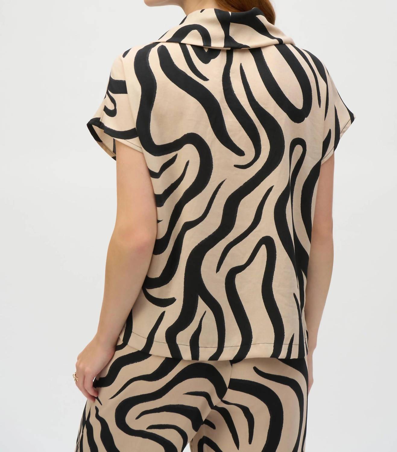 Pair this with your favorite jeans and slides for your next girls night out. Elevate your wardrobe with the Abstract Print Cowl Neck Top by Joseph Ribkoff, an elegant blend of style and comfort. This patterned top in beige and black features short dolman sleeves for a relaxed fit and a cowl neckline for a sophisticated touch. Made in Canada from 100% polyester, it promises a breathable experience perfect for evening events. Closure is a convenient pull-on style, and for care, it requires a gentle hand wash followed by laying flat to dry.