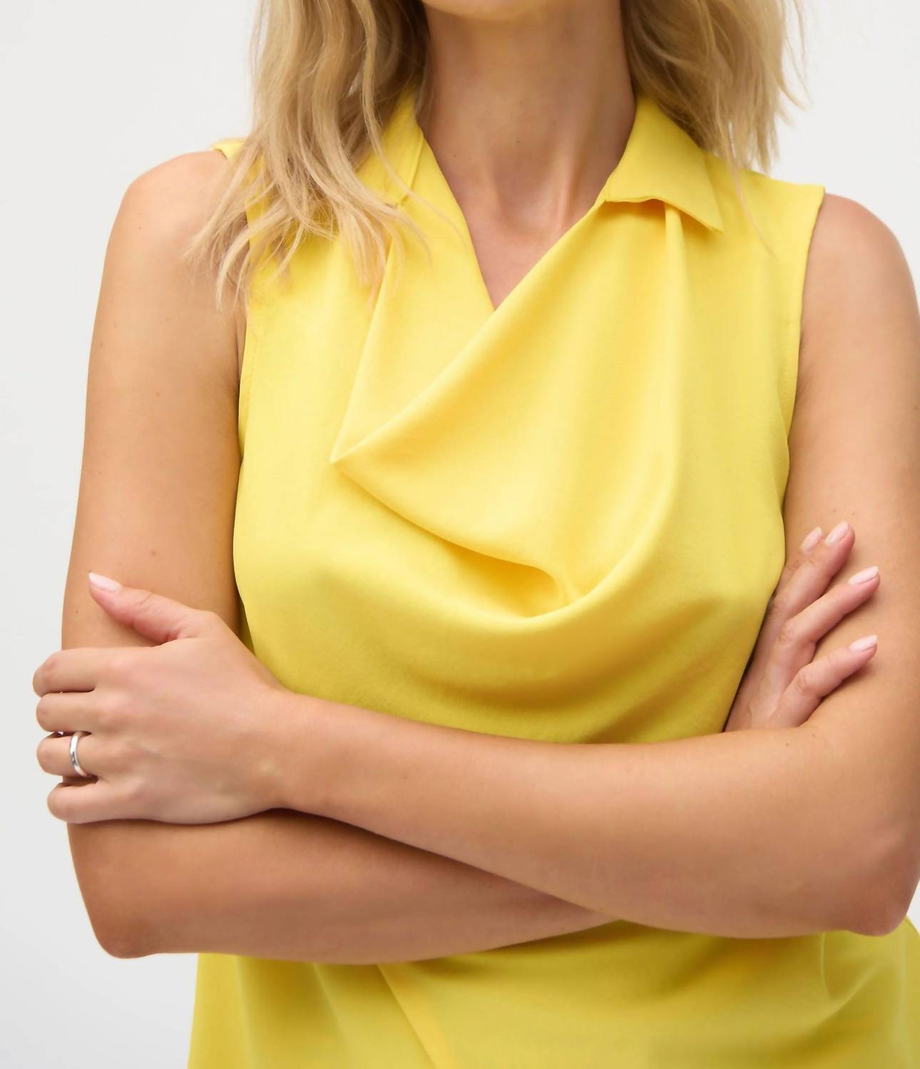 A timeless blouse that will never go out of style. Embrace minimalist elegance with the Joseph Ribkoff Collared Cowl Neck Sleeveless Top in vibrant Citrus. Crafted from 100% Polyester, this solid-color piece provides comfort and style, whether worn alone or as a chic layer. Made in Canada, this pullover top features a sophisticated collared design with a flattering cowl neckline. For best care, hand wash in cold water, lay flat to dry, and avoid tumble drying, ironing, and dry cleaning.