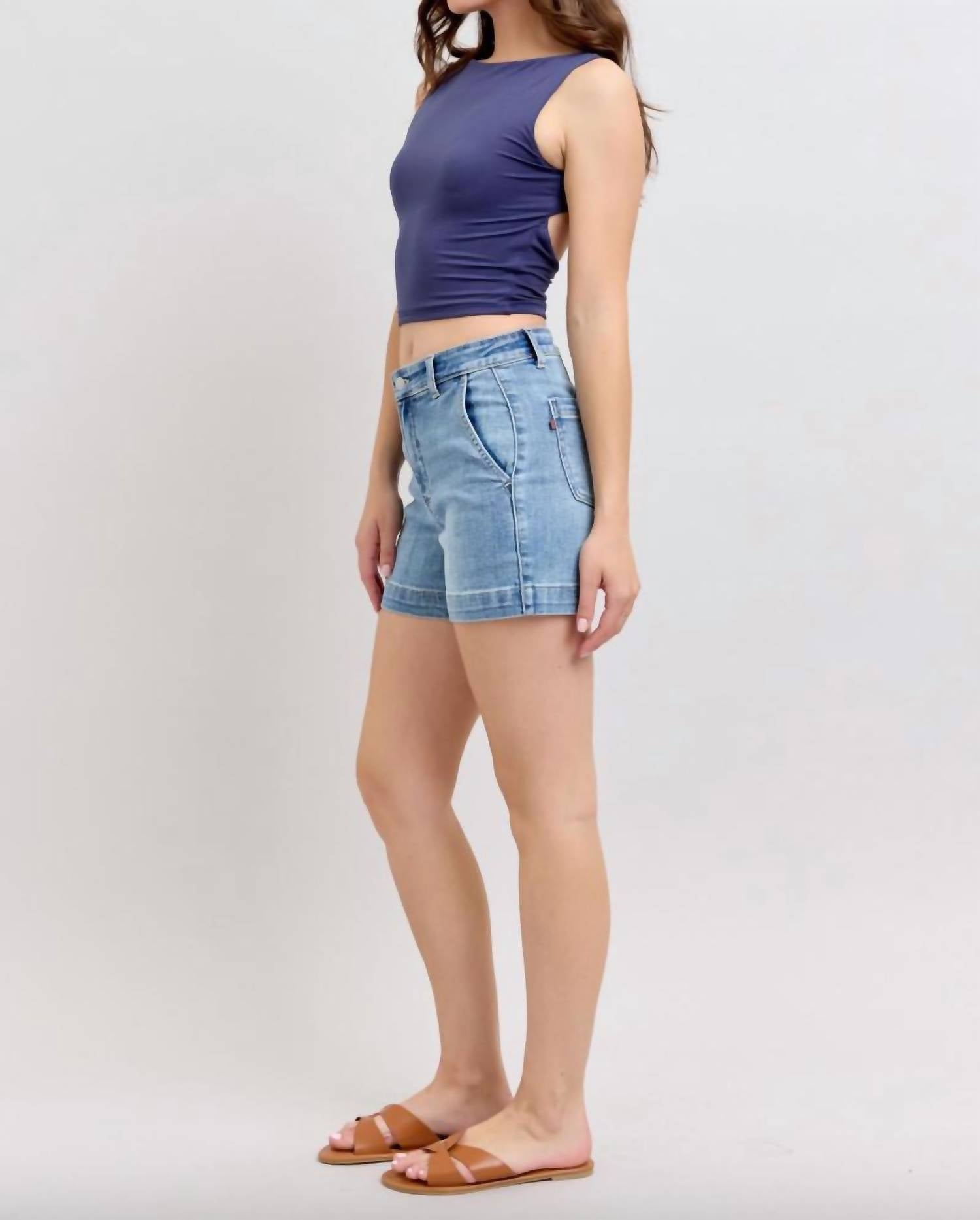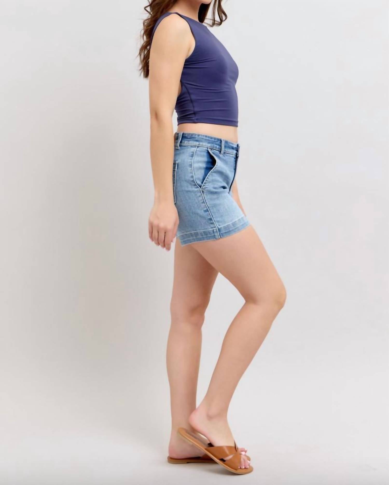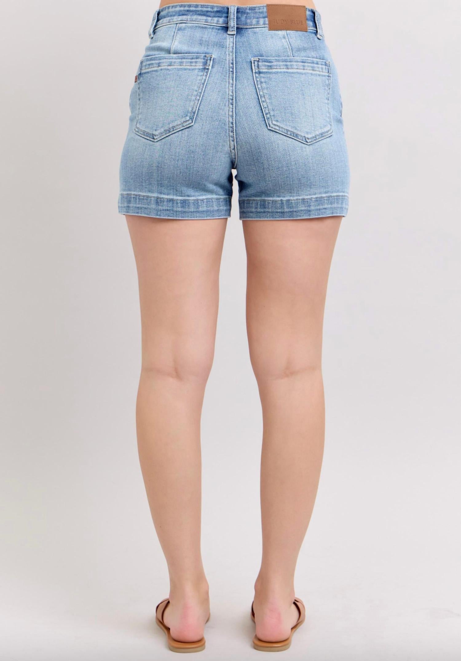 Jean shorts so versatile, you can literally wear them with anything. Elevate your summer style with the Judy Blue High Waist Trouser Shorts in a classic blue shade, perfect for minimalist travel looks. Crafted from a comfortable cotton blend of 93% Cotton, 6% Polyester, and 1% Spandex, these shorts feature a rise of 9.5" and an inseam of 4.25" for a flattering fit. Designed with a pull-on closure and convenient pockets, they offer both style and functionality. Care is a breeze with machine wash and tumble dry instructions, making them an ideal addition to any plus-size summer wardrobe.
