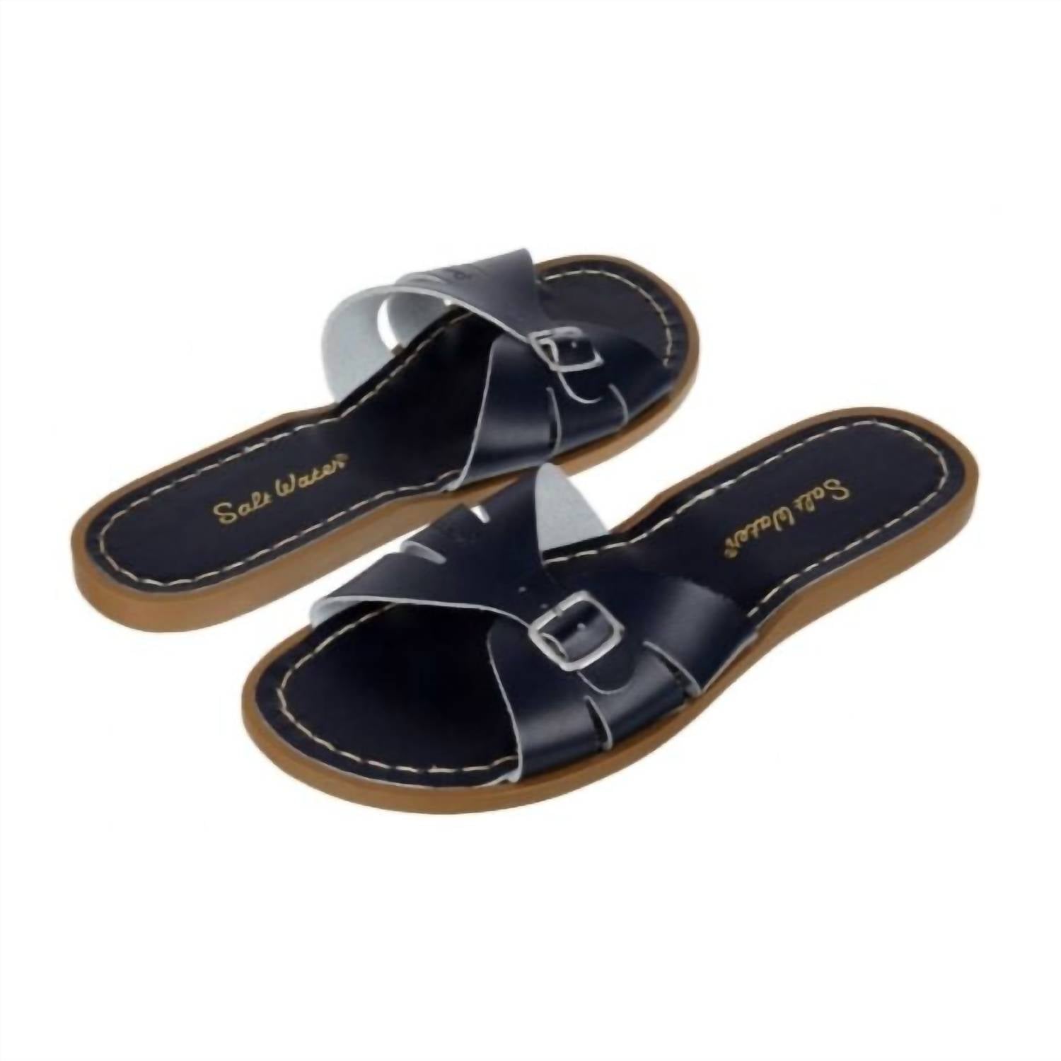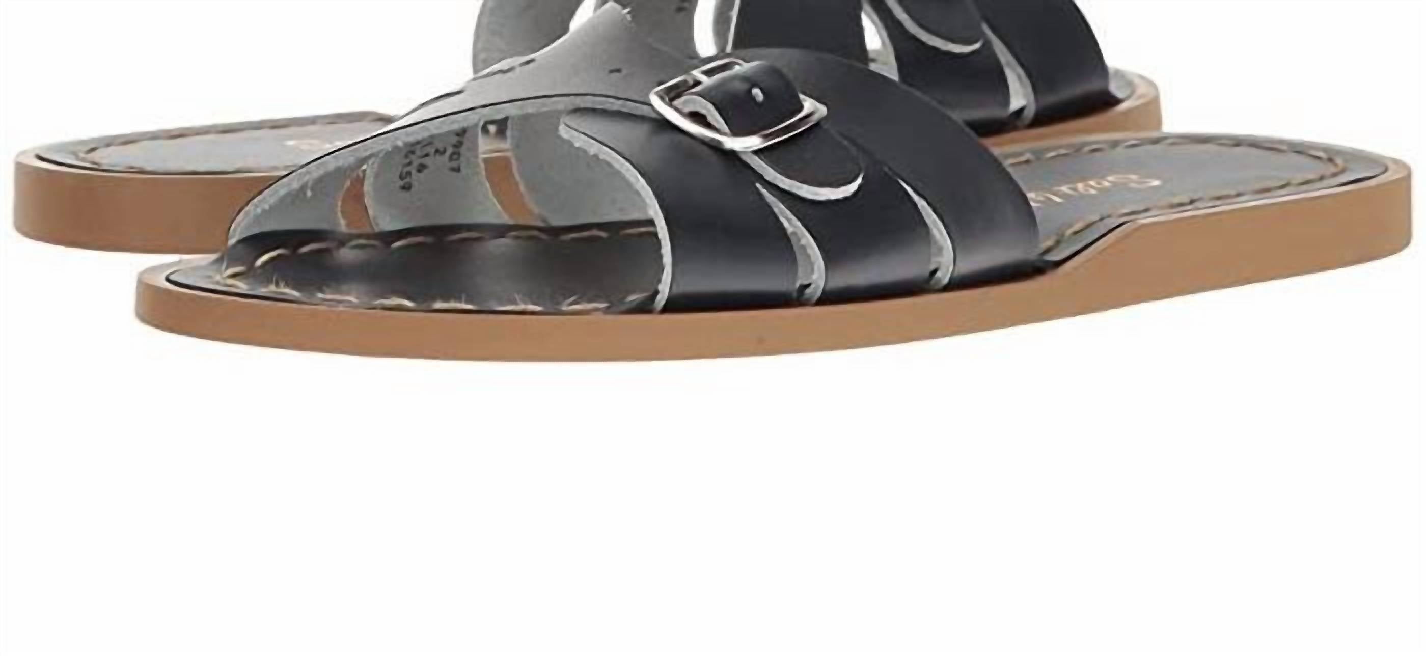 Flowy dresses, cropped pants, and even jumpsuits... this sandal works with them all! Enhance your summer wardrobe with the Women's Classic Slides Sandal by Salt Water Sandals, designed for both style and functionality. These black sandals feature a scuff-resistant, water-friendly genuine leather upper and lining, offering breathable comfort. Equipped with rust-proof brass buckles and an open toe shape, they're perfect for versatile in-and-out of water wear. Enjoy easy maintenance with a hand-stitched, non-slip molded rubber sole for added durability.