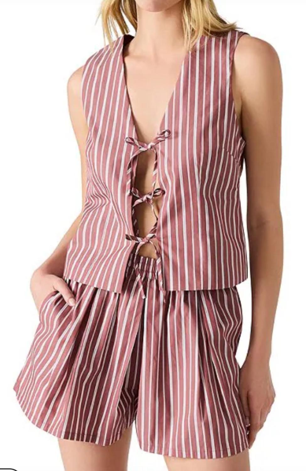 This classic tank top is perfect for layering and cute enough to wear on its own. Embrace a touch of retro elegance with the Aliza Top by STEVE MADDEN, tailored for the modern woman. This sleeveless tank top is crafted from premium cotton poplin and showcases a chic stripe print in a beautiful dusty brick hue. Designed with a stylish V-neckline and a tie front closure, it's perfect for warm summer days and effortless vacation wear. Care for it with a simple machine wash to keep this trending 90s fashion piece looking its best.