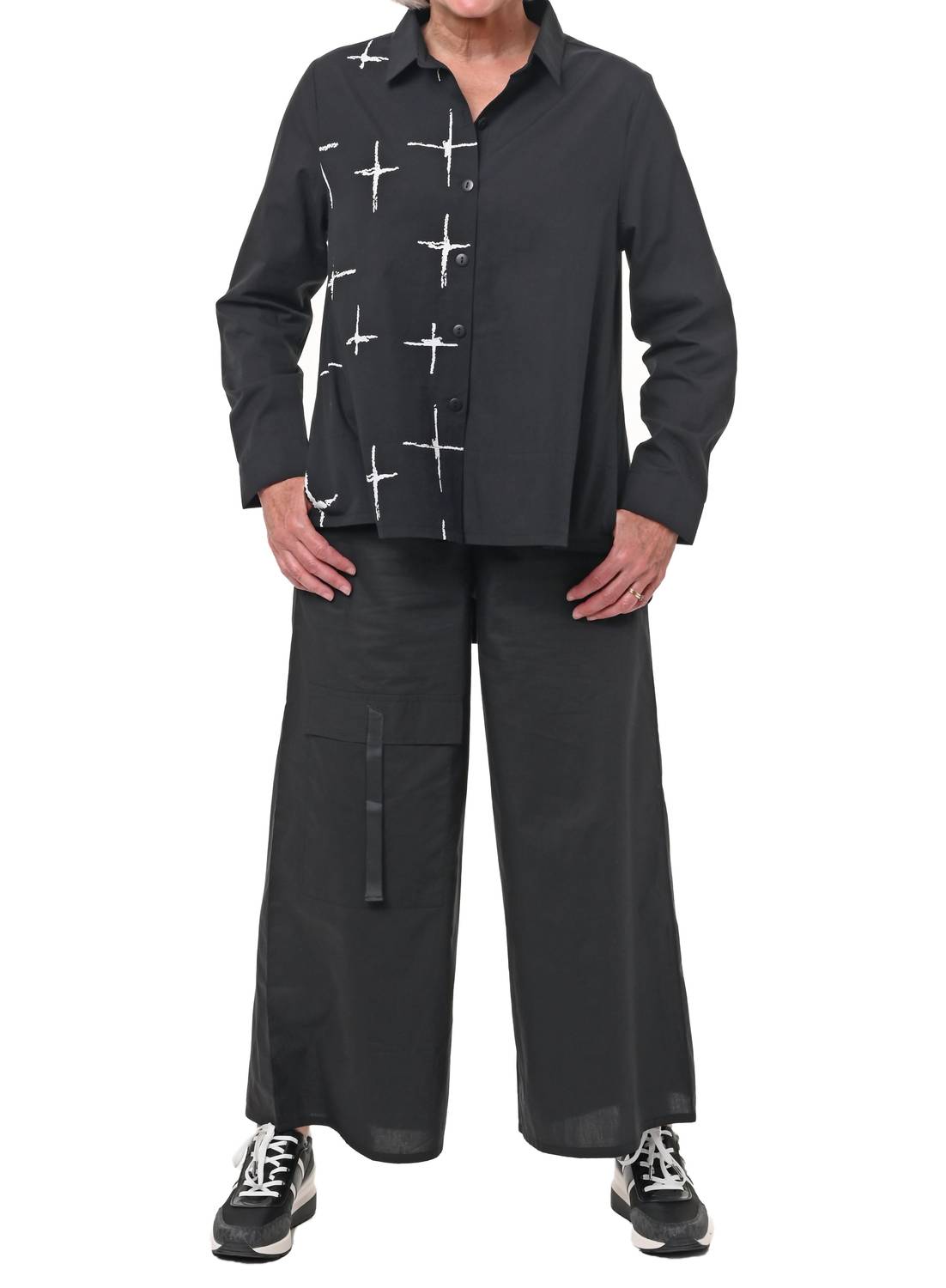 This button down shirt is comfortable yet polished. Discover the Farrah Button Down Shirt by Tulip Clothing, an exquisitely designed piece in a standout Black Galaxy print. This long-sleeved shirt combines solid black and a black/white graphic print seamlessly, featuring side seam pockets, a back pleat, and buttoned cuffs for added flair. Made from 100% cotton, this shirt comes with a button closure and is easy to care for with machine wash and line dry instructions. The garment length starts at 24.5" in size XS, extending to 27" in size XXL, with chest measurements spanning from 42" to 52". Model is wearing a size small. Front Center Length XS 24 1/2", S 25", M 25 1/2", L 26", XL 26 1/2", XXL 27". Back Center Length XS 29 3/4", S 30 1/4", M 30 3/4", L 31 1/4", XL 31 3/4", XXL 32 1/4". Chest XS 42", S 44", M 46", L 48", XL 50", XXL 52".