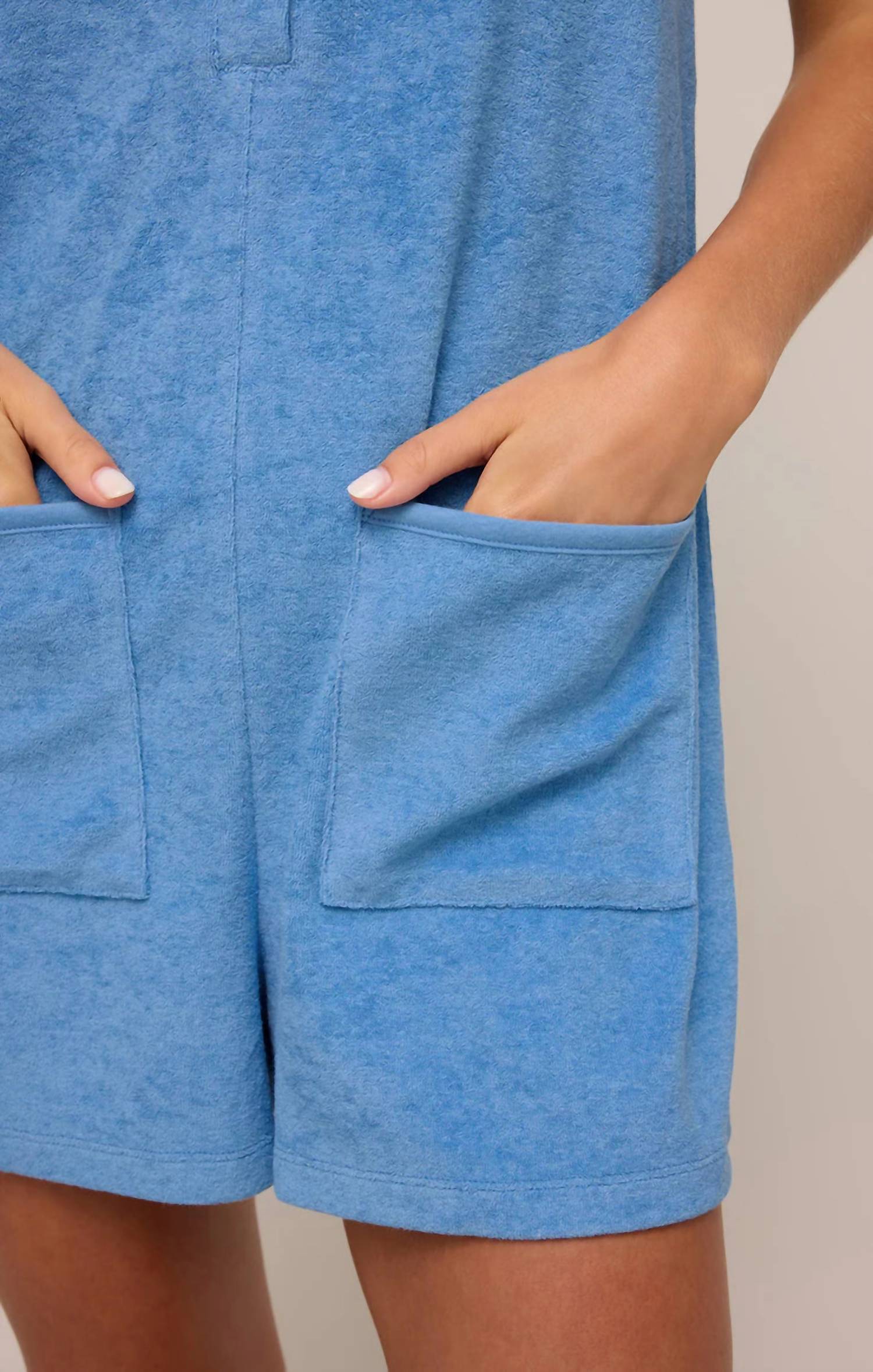 It doesn't take much for this one piece to look effortlessly cool. Add some statement jewelry to dress it up, or throw on some sneakers for a more casual vibe. Embrace sunny days with the Brighter Days Terry Romper by Z Supply, a stylish addition to any wardrobe in a refreshing blue hue. This sleeveless romper features a regular fit enhanced by a button front closure and a neat patch pocket. Made from Loop Terry Cloth, it boasts a composition of 76% Cotton and 24% Polyester, ensuring comfort and breathability. Care for your garment effortlessly with machine wash and tumble dry instructions.
