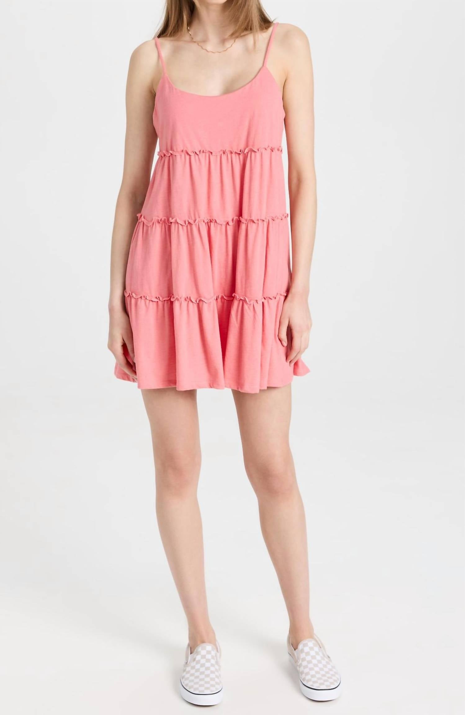 The perfect mini dress for those warmer months.This Carina Mini Dress is made of soft and comfy CVC Jersey knit fabric, features tiered layers with inverted ruffles and a slight scoop neckline. Fabric Content: CVC Jersey 60% Cotton 40% Polyester.