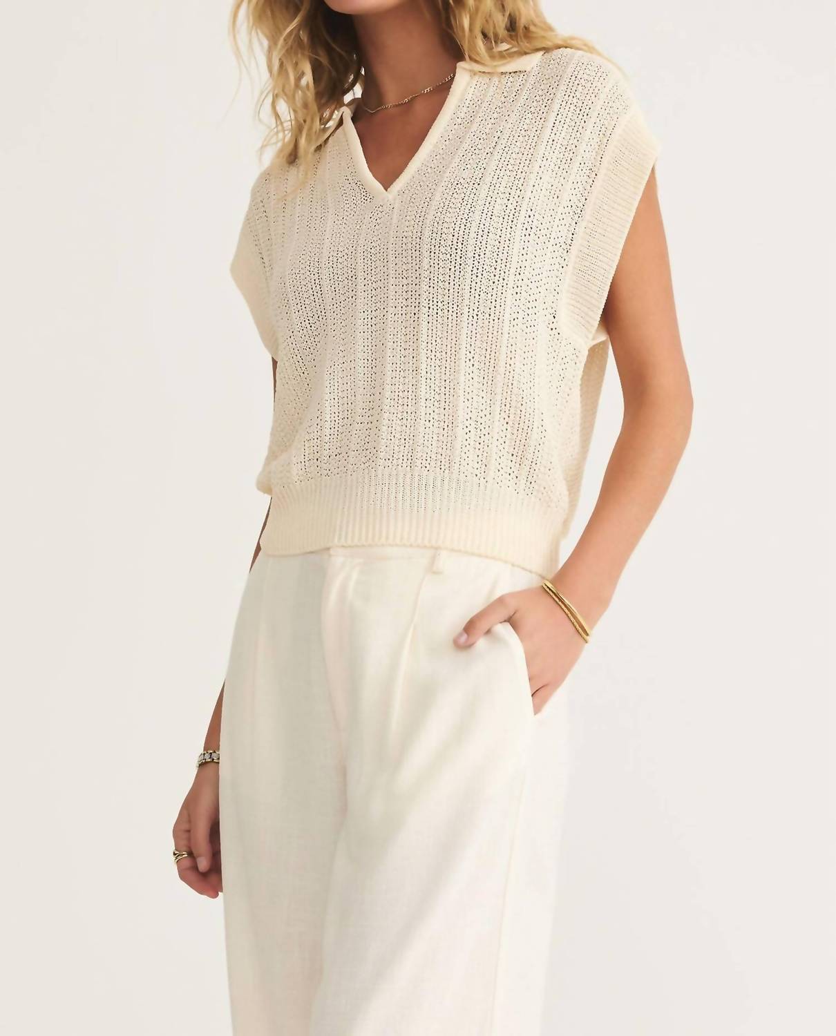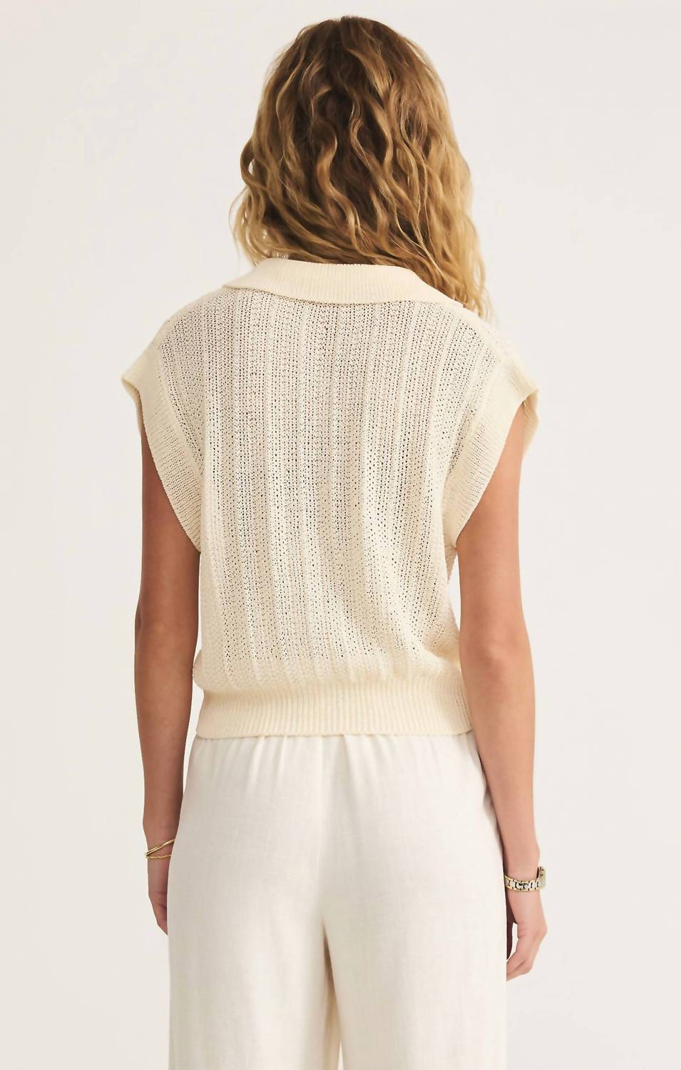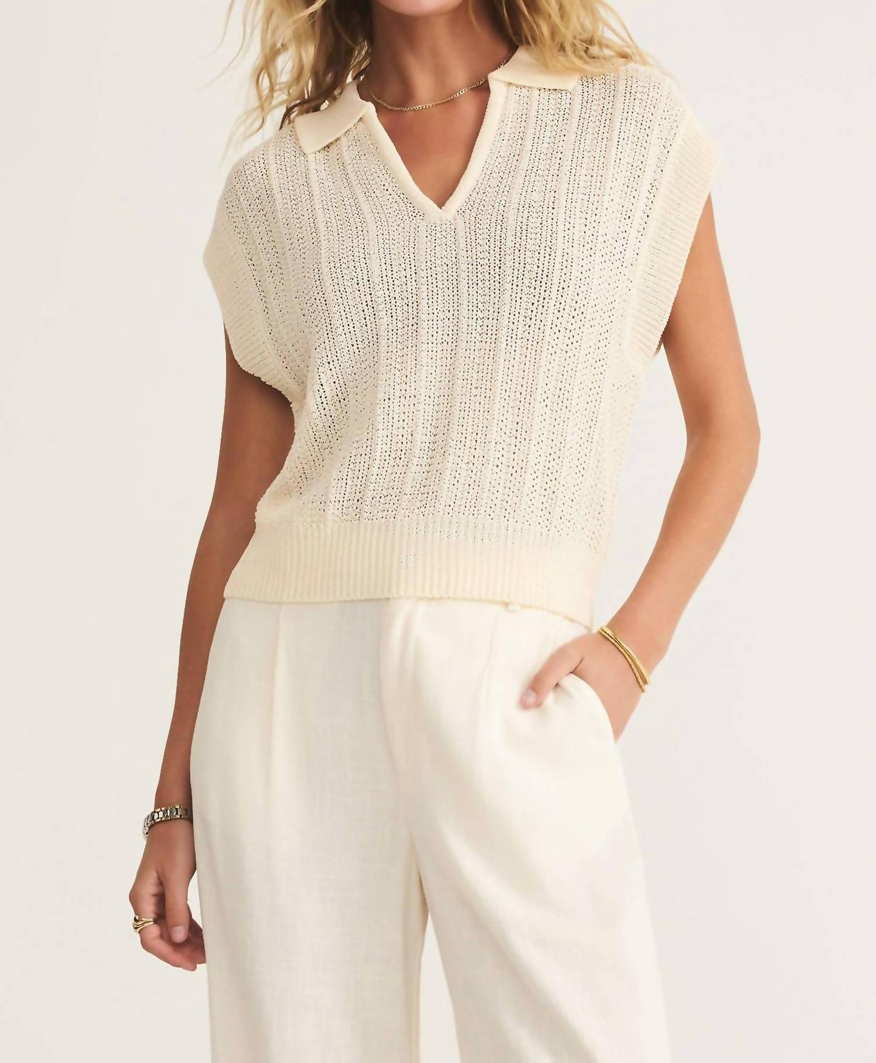 A versatile blouse that works from desk to dinner! Embrace summer with the Z Supply Lauden Polo Top in Sea Salt, a lightweight and stylish pick for beach days. This textured knit blouse features a short sleeve design and a trendy v-neckline with a classic collar. Crafted from comfortable acrylic material, it measures 21 inches in length for size small. Pull-on style. Hand wash and lay flat to dry. 65% Acrylic 35% Nylon.