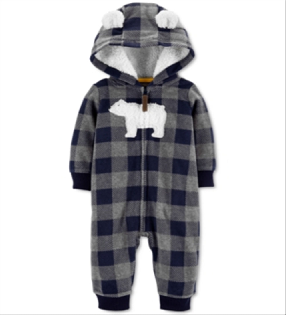 Carter's Boy's Plaid Buffalo Check Polar Bear Ears Hooded Fleece Playsuit Gray Size 3MOS