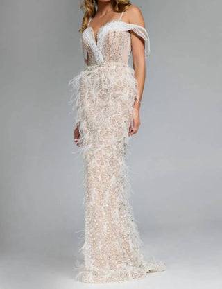 Jovani - Feathered Plunge Gown With Dazzling Embellishments
