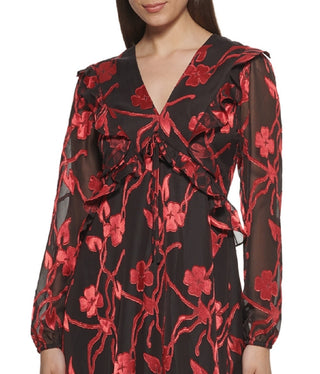 Kensie Dresses Women's Ruffled Zippered Lined Blouson Sleeve V Neck Short Formal Fit Flare Dress Black Size 12
