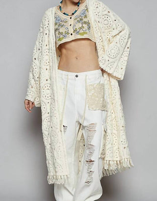 Pol - Crochet Fringe Open Front Longline Cardigan