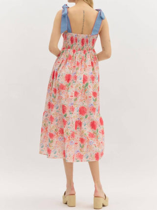 Entro - Floral Print Midi Dress With Pink Shoulder Ties